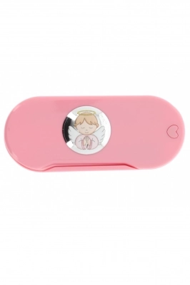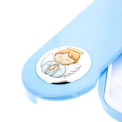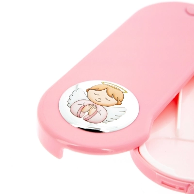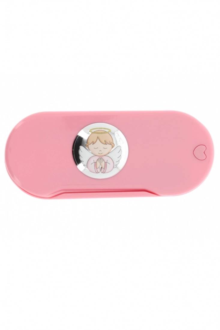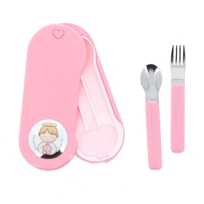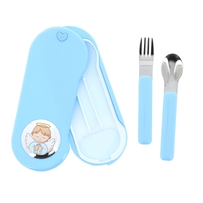Set pappa composto da cucchiaino e forchettina contenuti in una pratica scatolina di plastica alimentare rosa o azzurra. Sulla scatolina è applicata una targhetta di argento Mirò con la raffigurazione di un angelo in preghiera con dettagli colorati. Set ideale da portare in borsa per pranzi o cene fuori casa. L'articolo è un'ottima idea regalo in occasione di un Battesimo, di una nascita o anche di un primo compleanno, ma è un prodotto consigliato anche per l'inizio dello svezzamento. Adatti e sicuri per il bambino. Realizzato in Italia da un'azienda leader nella produzione di quadri e oggettistica da regalo in argento.