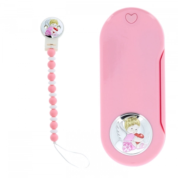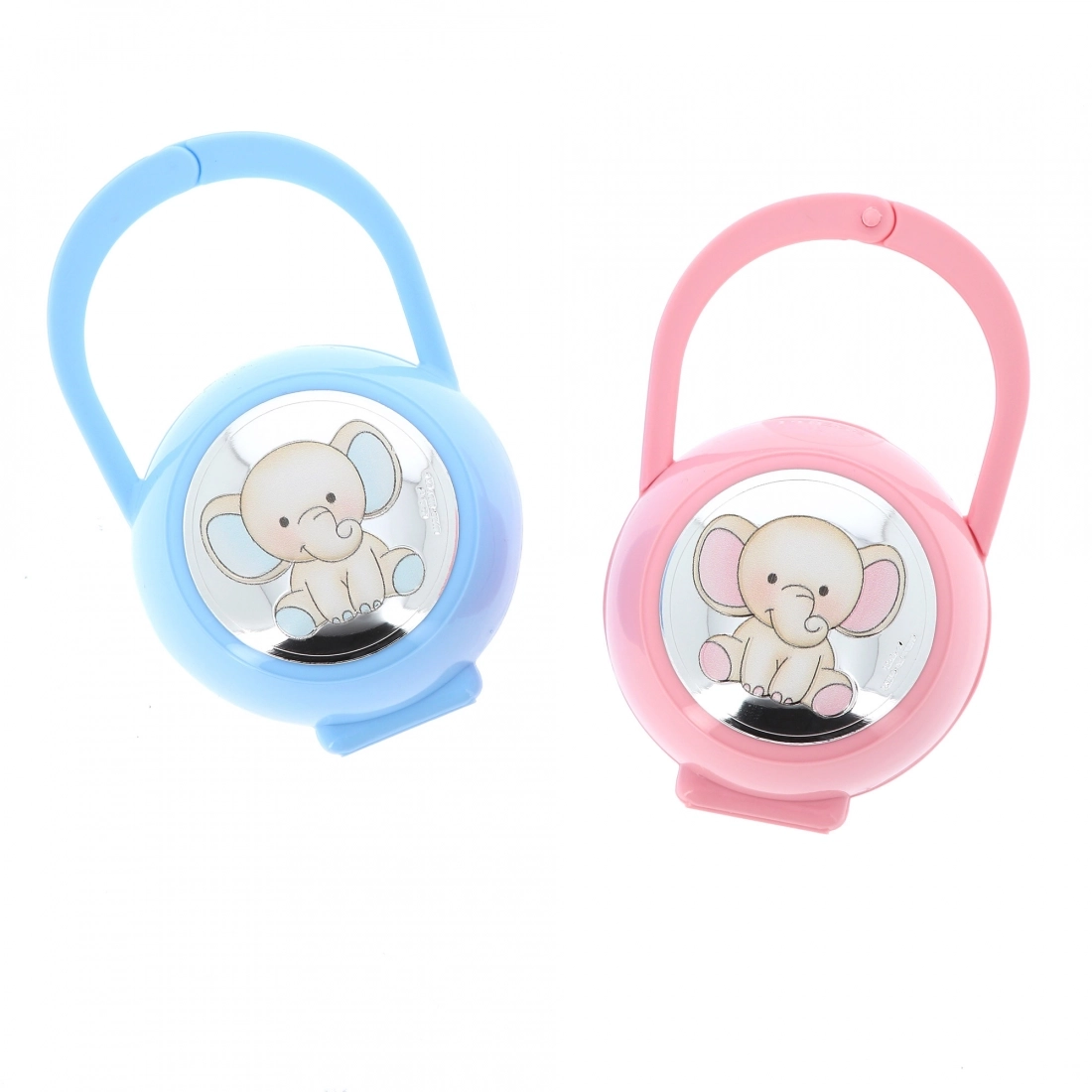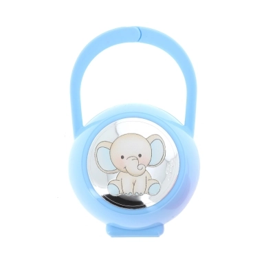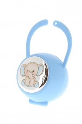 Box porta ciuccio azzurro o rosa decorato con un simpatico elefantino in argento Mirò con dettagli colorati. Ottima idea regalo in occasione di un Battesimo o di una nascita. L'articolo è confezionato nella sua originale scatolina e completo di certificazione del produttore. Realizzata in Miro Silver, nuovo metallo che include uno strato di argento puro 999,95%, conferendo al metallo una grande solidità e resistenza all'ossidazione. Realizzato in Italia da un'azienda leader nella produzione di quadri e oggettistica da regalo in argento.