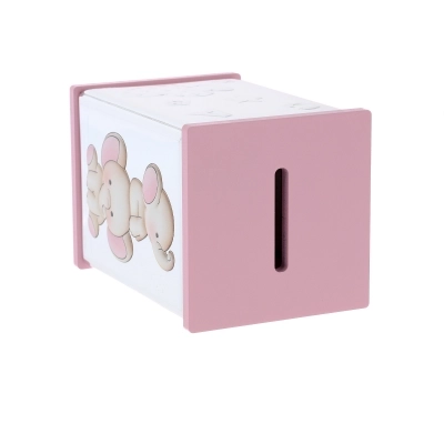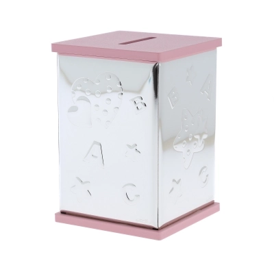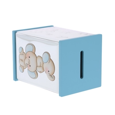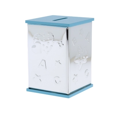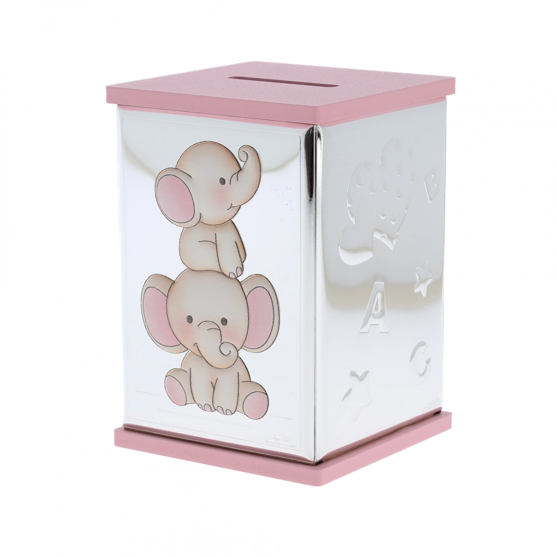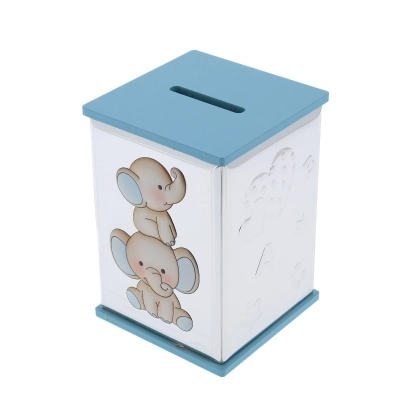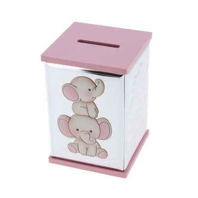 Salvadanaio, azzurro o rosa (misura 8x8 cm e ha un'altezza di 11 cm), con la raffigurazione di un elefantino in argento Mirò con dettagli colorati. Realizzata in Miro Silver, nuovo metallo che include uno strato di argento puro 999,95%, conferendo al metallo una grande solidità e resistenza all'ossidazione. Ottima idea regalo in occasione di un Battesimo o di una nascita. L'articolo è confezionato nella sua originale scatolina e completo di certificazione del produttore. Realizzato in Italia da un'azienda leader nella produzione di quadri e oggettistica da regalo in argento.