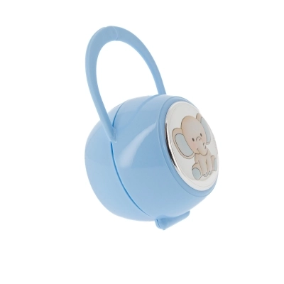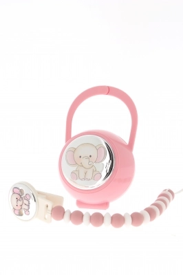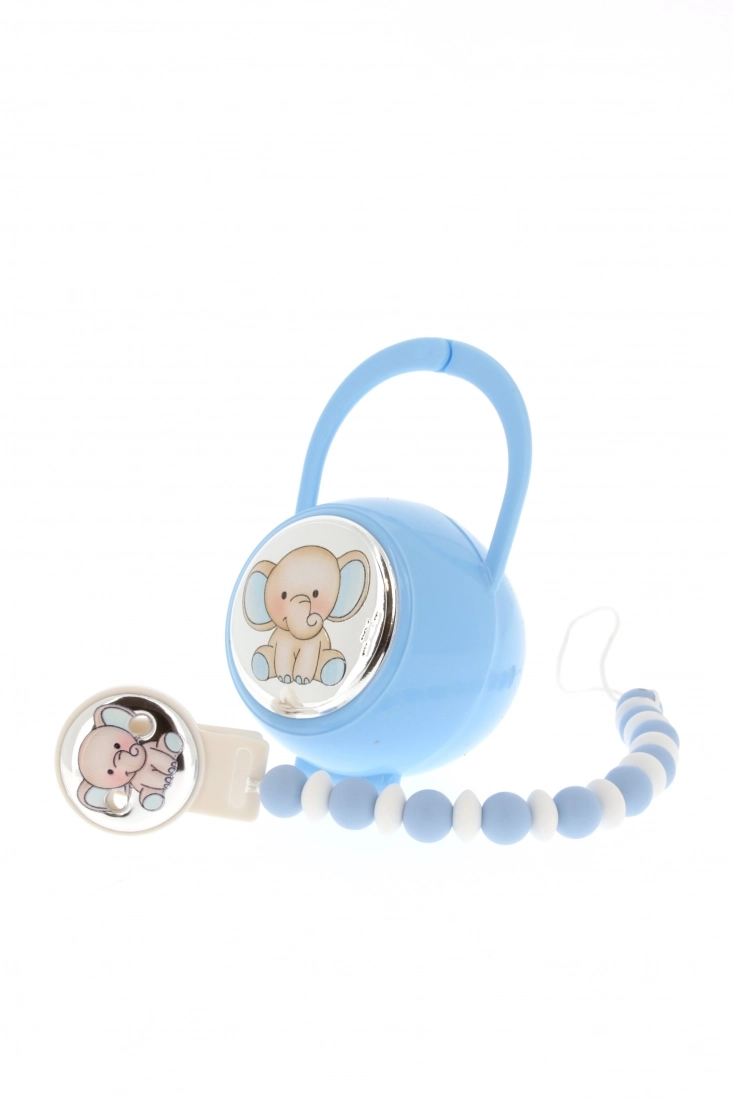 Confezione composta da una catenella portaciuccio (cod. 43337) e box portaciuccio in plastica (cod. 43336). La catenella portaciuccio è in silicone alimentare adatta per la dentizione del bambino ed è dotata di clip in plastica con placchetta in argento raffigurante un Elefantino e di nastrino dove appendere il ciuccio. All'interno della confenzione è presente anche una box porta ciuccio in plastica, con applicata una targhetta in argento con la stessa raffigurazione posta sulla clip della catenella portaciuccio. Adatti e sicuri per il bambino. Ideale da regalare in occasione di una Nascita o di un Battesimo. Realizzato in Italia da un'azienda leader nella produzione di quadri e oggettistica da regalo in argento.