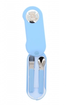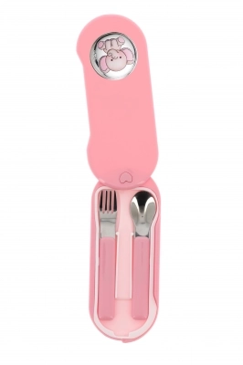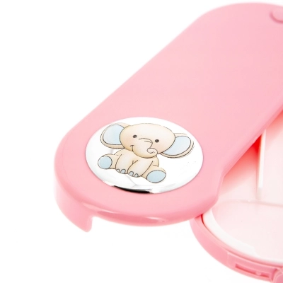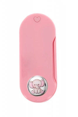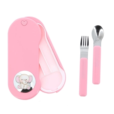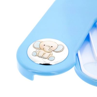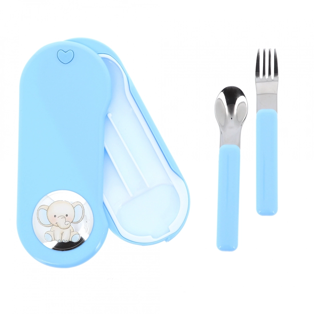 Set pappa composto da cucchiaino e forchettina contenuti in una pratica scatolina di plastica rosa o azzurra. Sulla scatolina è applicata una targhetta di argento laminato con la raffigurazione di un elefantino con dettagli colorati. Set ideale da portare in borsa per pranzi o cene fuori casa. L'articolo è un'ottima idea regalo in occasione di un Battesimo, di una nascita o anche di un primo compleanno, ma è un prodotto consigliato anche per l'inizio dello svezzamento.