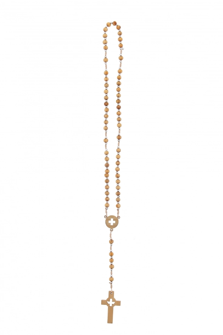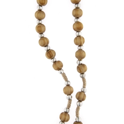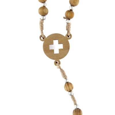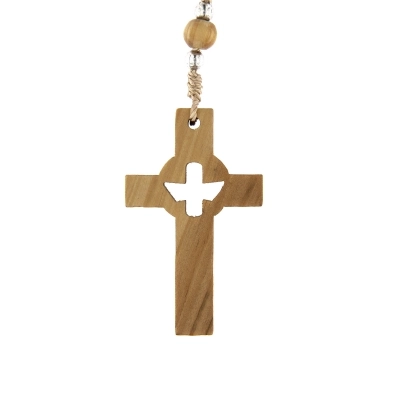 Semplice e bella corona del rosario realizzata in corda e grani in legno d'ulivo di diametro 6 mm. Ad ogni grano in olivo sono affiancati dei grani in metallo argentato di diametro 4 mm. Sia la croce che la crociera sono in legno d'ulivo ed entrambe sono traforate: sulla croce è intagliata la colomba, simbolo dello Spirito Santo, mentre sulla crociera è intagliata una croce. Pratica e comoda per la preghiera, questa corona è ideale per portarla sempre con sé. La corona non ha un gancio per l'apertura, ma la grande circonferenza la rendono comunque indossabile.