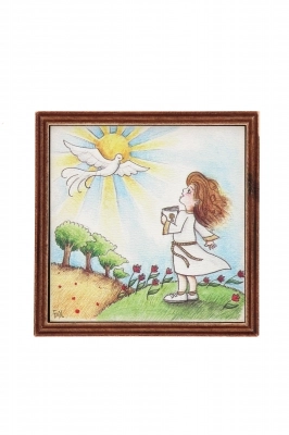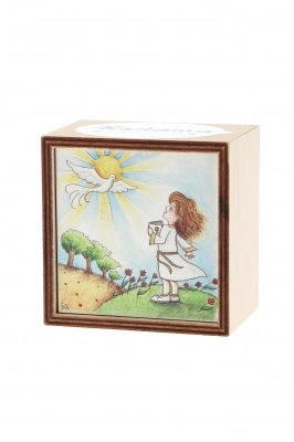 Piantina Kodama in cubo di legno - immagine Comunione bimba. Dimensioni 10x10 cm