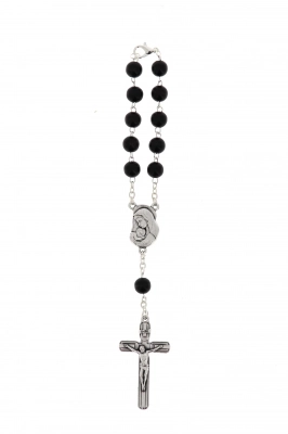 Bracciale decina con chiusura a moschettone e grani in legno di 66 mm. La Crociera è in metallo e raffigura la Sacra Famiglia, la croce invece è sempre in metallo e misura 2x4 cm