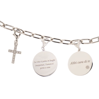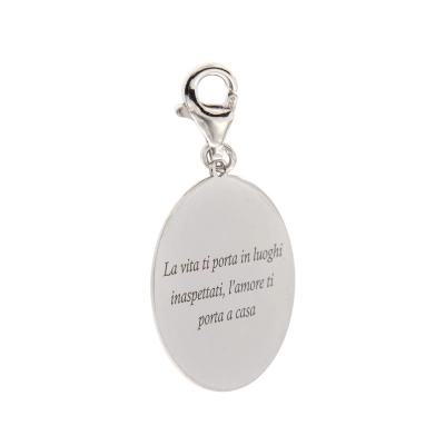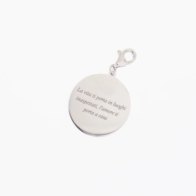 Ciondolo in argento 925, del diametro di 2 cm, dotato di moschettone per essere agganciato. Sul ciondolo è incisa la frase "La vita ti porta in luoghi inaspettati, l'amore ti porta a casa", messaggio da donarsi e da donare per ricordare sempre la forza dell'amore. Questo articolo fa parte della collezione Custodi e in particolare della nuova linea che permette di personalizzare il bracciale codice 43154 con tutta una vasta gamma di ciondoli. Scegli il ciondolo con il "messaggio" che più parla di te o della persona a cui vuoi regarlo. Perfetto come idea regalo per fare un dono che arriva dritto al cuore!