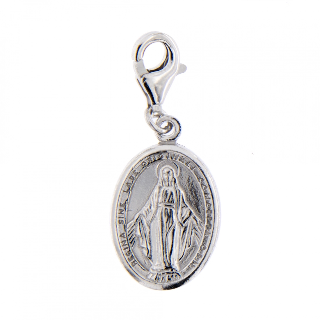 Ciondolo Medaglia Miracolosa in argento 925, dotato di moschettone per essere agganciato. Questo articolo fa parte della collezione Custodi e in particolare della nuova linea che permette di personalizzare il bracciale codice 43154 con tutta una vasta gamma di ciondoli. Scegli il ciondolo che più parla di te o della persona a cui vuoi regarlo. Perfetto come idea regalo per fare un dono che arriva dritto al cuore!