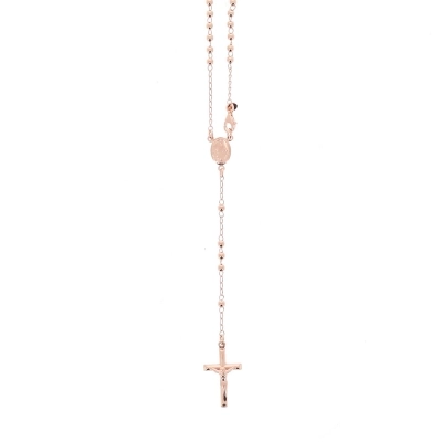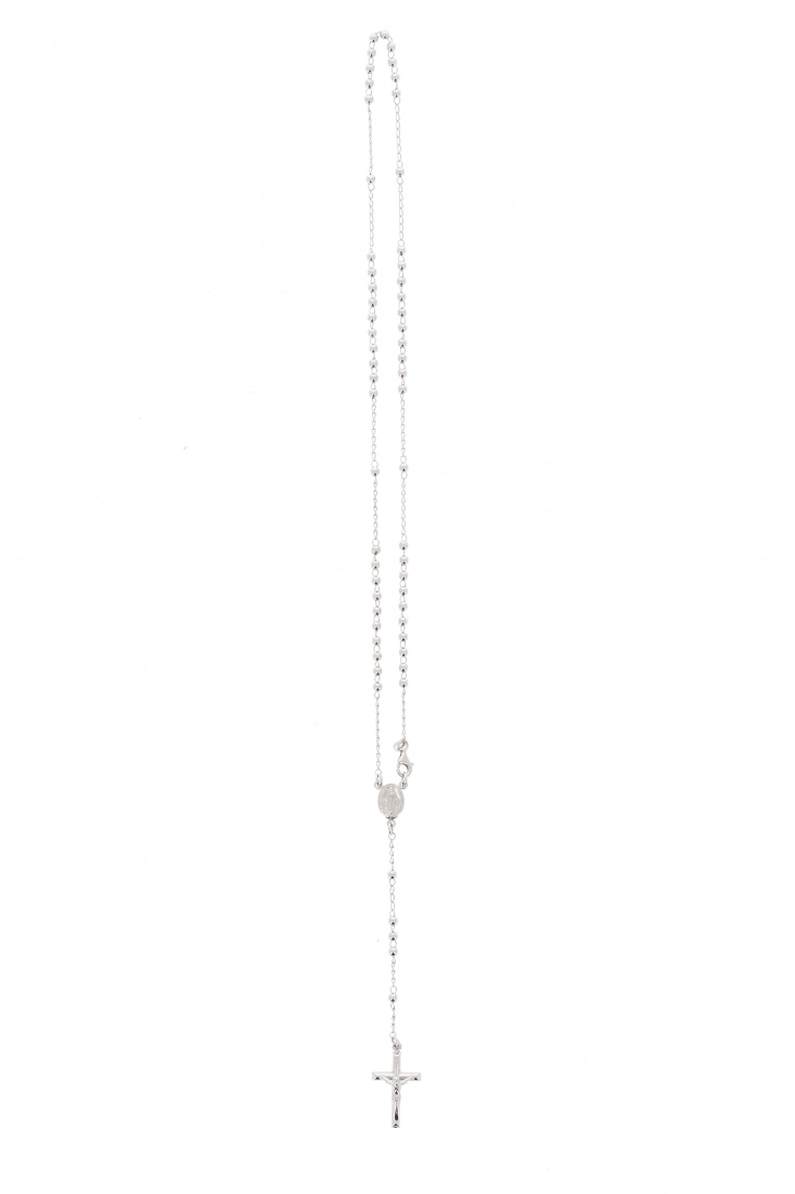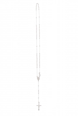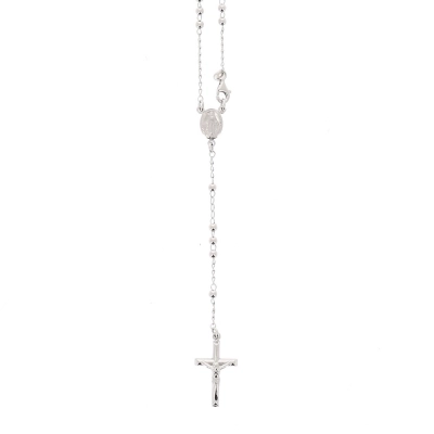 Bellissimo rosario in argento 925 rodiato, con grani del diametro di 3 mm e Crocifisso delle dimensioni 1x1,5 cm. È dotato di moschettone che che ne consente l'apertura e la chiusura, così da poterlo indossare facilmente. Disponibile nella variante argentata, dorata e rosè. Lunghezza 44 cm