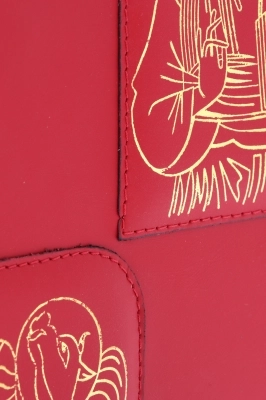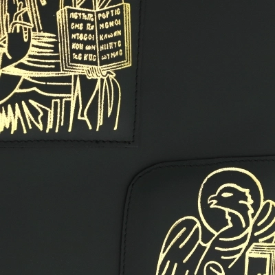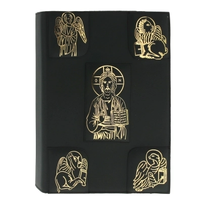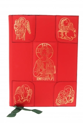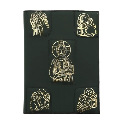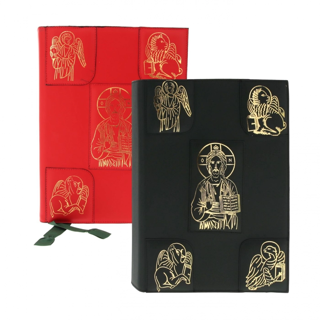 Preziosa custodia in pelle per Lezionario domenicale e feriale, decorata con Cristo Pantocratore, stampato al centro, e i quattro evangelisti applicati negli angoli; tutte le decorazioni sono in stampa foglia oro. Sul dorso è presente, inoltre, una pregiata lavorazione in rilievo. La custodia garantisce la salvaguardia di questo libro prezioso ed è anche un'ottima idea regalo. All'interno, è rivestita con un'elegantissima stoffa dall'effetto setato ed è completa di due bandelle di 7,5 cm, in pelle, in cui è possibile inserire la copertina del libro, così da rendere più pratica la consultazione. Adatta per volumi con dimensioni 30,5x21,5x6 cm. Disponibile nelle colorazioni verde e rossa. Realizzata in Italia da un'azienda artigianale che opera da anni nel settore della pelletteria.