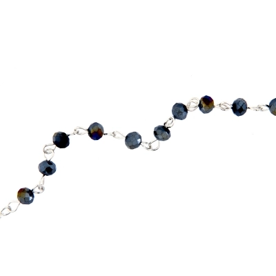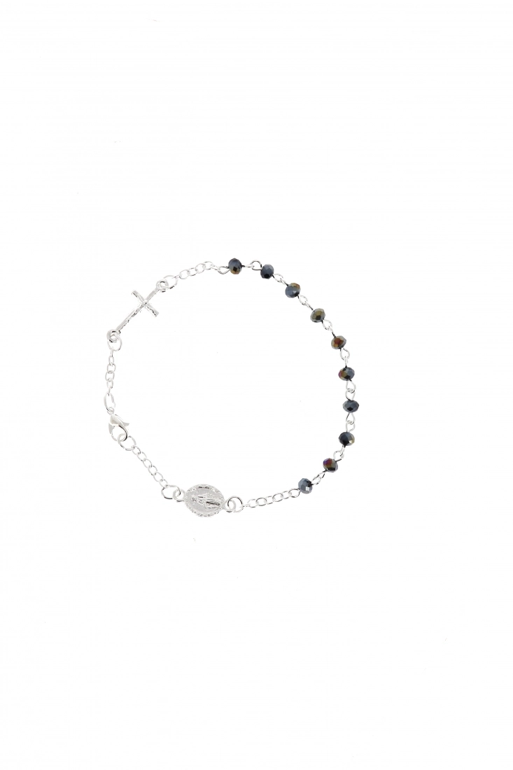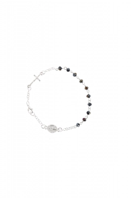 Raffinato bracciale in metallo argentato con grani in simil-cristallo nero da 4 mm, che rappresentano proprio una decina del rosario. Ad arricchire il bracciale, sono sati aggiunti una crocetta e una medaglia Miracolosa agli estremi della decina. La dimensione dei grani e la loro particolarità rendono il bracciale molto fine, delicato e pratico da indossare. Perfetto per essere indossato tutti i giorni e utile per poter pregare il Santo Rosario.