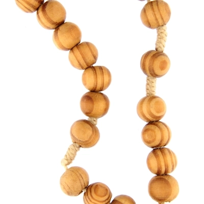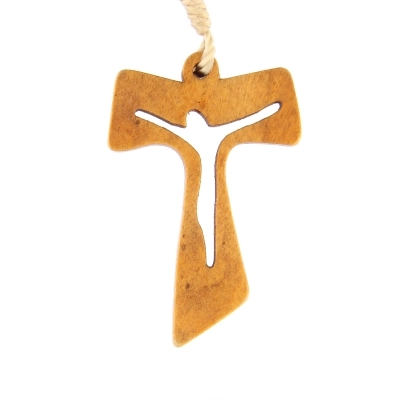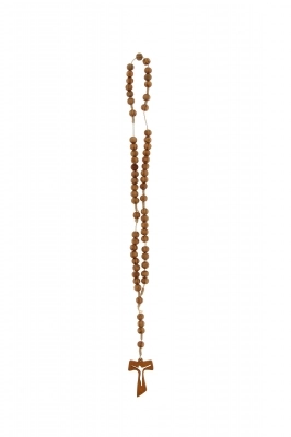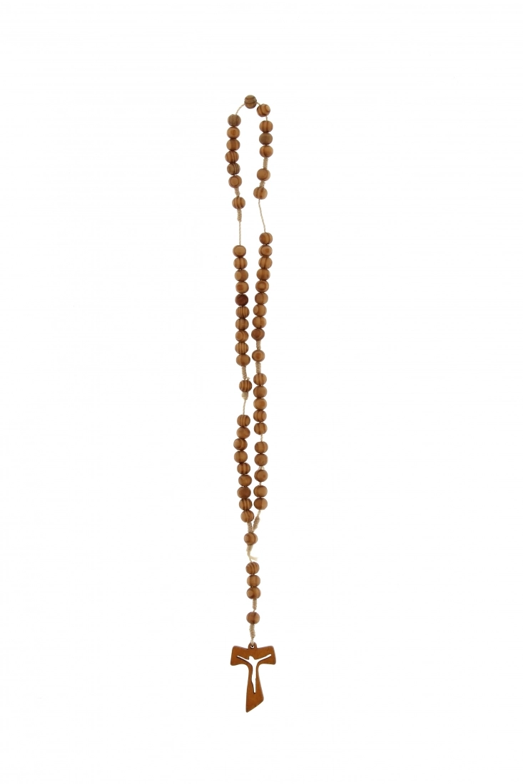 Corona del Rosario in corda, con grani in legno di pino, la cui colorazione è molto simile a quella del legno di olivo. I grani sono del diametro di 10 mm. La croce finale ricorda un Tau ed è traforata con la sagoma del corpo di Gesù. Anche se non ha il moschettone, la corona può essere indossata grazie alla grandezza dei grani. Molto pratica per pregare in quanto i grani scorrono leggermente sulla corda.
