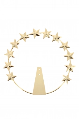 Stellario in ottone dorato con 12 stelle a 5 punte del diametro di 10 cm. Quest' aureola è adatta per qualsiasi tipologia di statua, ma più comunemente viene utilizzata per le statue raffiguranti la Madonna. Questo stellario è interamente prodotto in Italia da un'azienda di esperti artigiani.