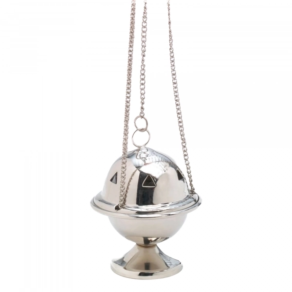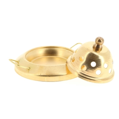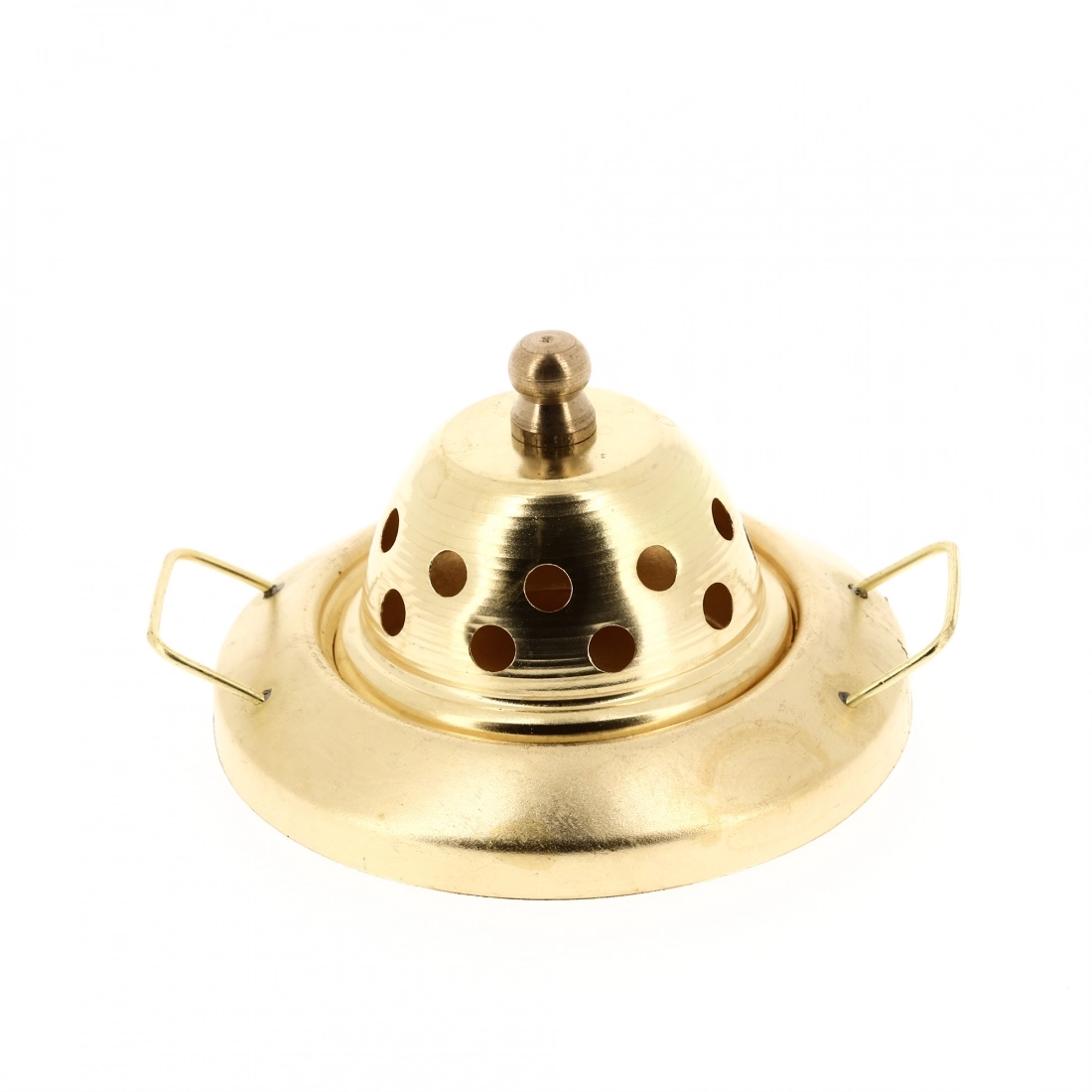 Bruciaincenso in metallo dorato, composto da una base dotata di maninci e coperchio forato. Prodotto molto semplice da utilizzare: basta appoggiare un carboncino all'interno della base e poi, dopo averlo acceso, inserire i grani di incenso sul carboncino e coprire con il coperchio. Grazie ai fori per l'areazione, l'essenza si diffonderà per tutto l'ambiente circostante.