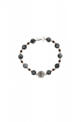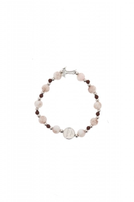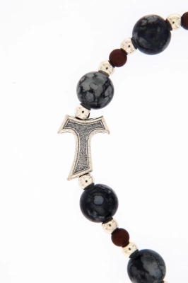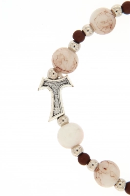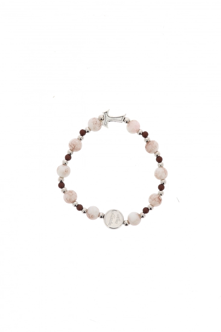 Raffinato bracciale decina con particolari grani effetto marmo del diametro di 8 mm, intervallati da piccoli grani color argento e marrone che si abbinano perfettamente alle colorazioni del grano principale. Il bracciale è dotato anche di una crocetta Tau in metallo color argento e di una medaglietta con scritto "Ave Maria".