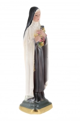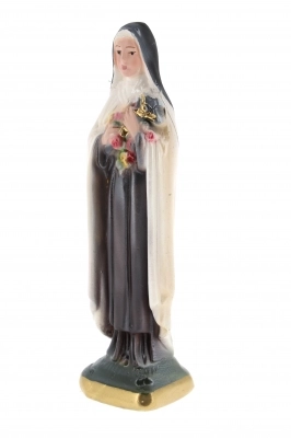 Statua di santa Teresina di Lisieux, dell'altezza di 15 cm, realizzata in gesso e dipinta a mano con colori madreperlati. Santa Teresina è stata proclamata Dottore della Chiesa, perché il suo cammino spirituale - ispirato alla "piccola via" della semplicità evangelica - è stato così innovativo e maturo e i suoi scritti così ricchi di intuizioni di fede profondissime da renderla un punto di riferimento per tutta la cristianità.