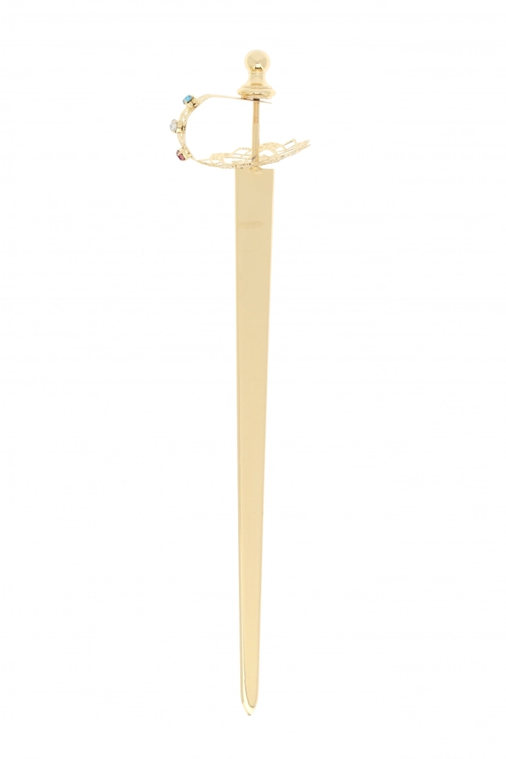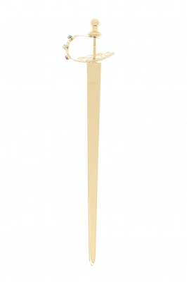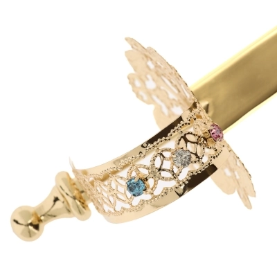 Spada di san Michele Arcangelo, della lunghezza di 26 cm, in ottone dorato con impugnatura in filigrana impreziosita da strass colorati. La larghezza dell'elsa della spada misura 6 cm. Prodotto interamente realizzato in Italia da un'azienda di esperti artigiani.