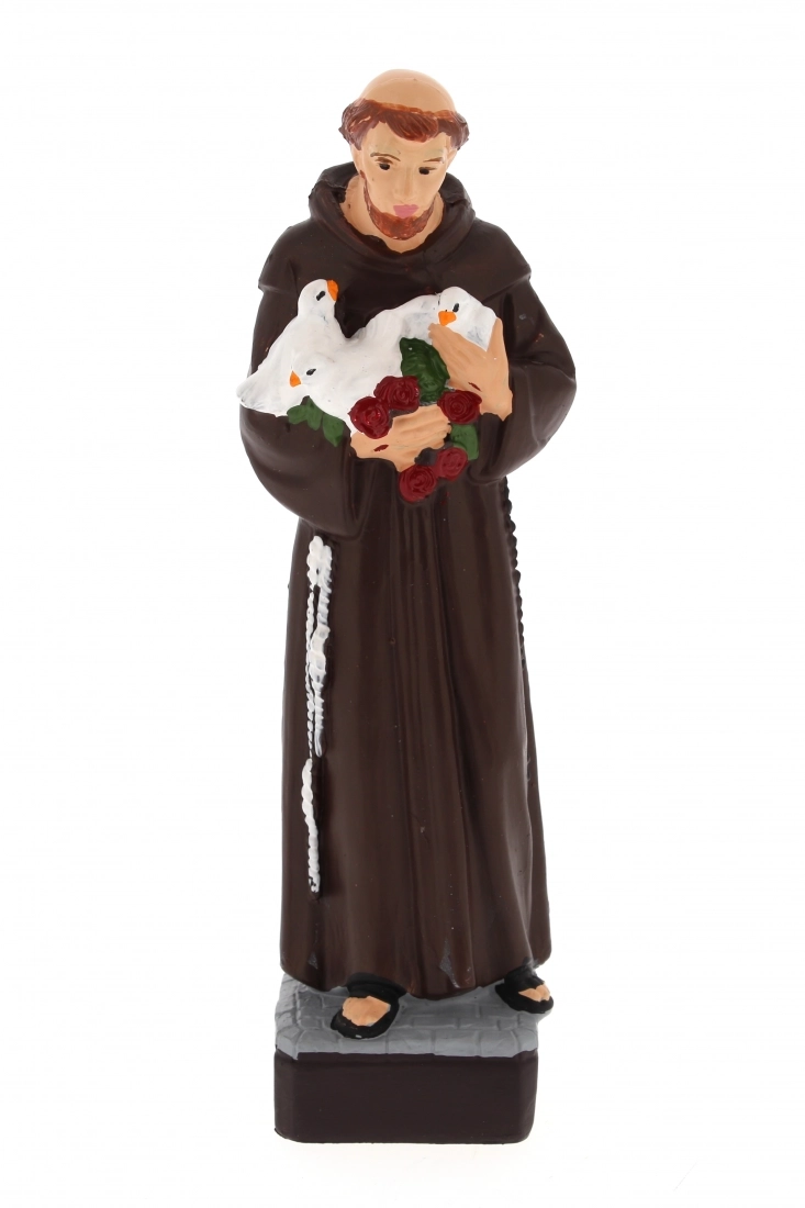 Statua di san Francesco, dell'altezza di 16 cm, realizzata in materiale infrangibile e quindi adatta per essere tenuta anche all'esterno. È dipinta a mano con dei bei colori vivaci. San Francesco d'Assisi è considerato il fautore di un rinnovamento spirituale fondamentale nella storia della cristianità. Nella sua spiritualità, Dio è il sommo bene dal quale proviene ogni altro bene e di Dio parla ogni cosa nel mondo, per questo bisogna ringraziare e lodare il Signore per tutto e vivere in perfetta letizia.