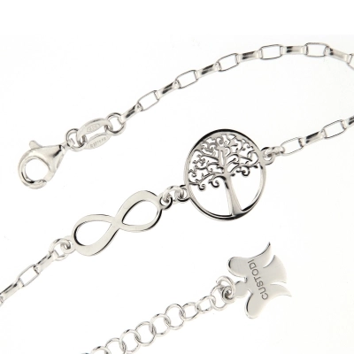 Bracciale in argento 925 (della lunghezza di 17 + 3 cm), realizzato con forzatina rettangolare, Albero della Vita e simbolo dell'infinito. L'albero della vita è simbolo di prosperità, salute e buona fortuna per tutti coloro che lo portano con sé in un gioiello; l'infinito esprime l'augurio che questi doni durino per sempre. È sicuramente un bracciale dal forte impatto emotivo sia per chi lo regala sia per chi lo riceve. Realizzato artigianalmente in Italia per la linea Custodi della Casa Editrice Shalom, è un oggetto raffinato e significativo da regalarsi e da regalare!