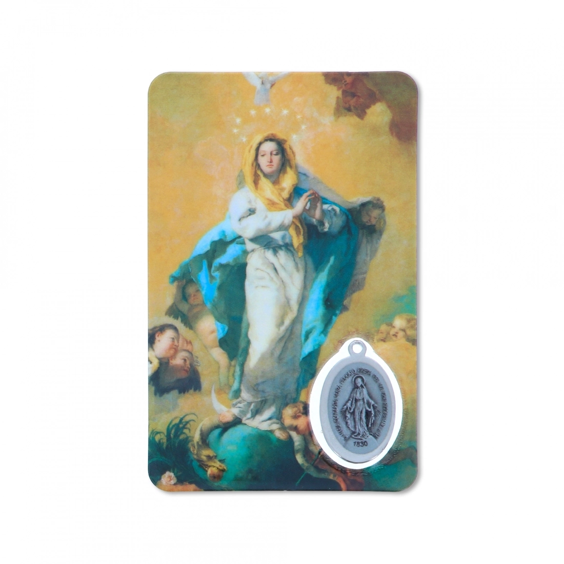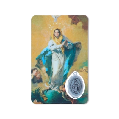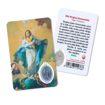 Card plastificata da collezione, delle dimensioni di 5,5 x 8,5 cm, con inserto medaglia Miracolosa. La card è delle dimensioni di un bancomat, per cui può essere posta ovunque, anche dentro al portafogli, per portare con sè la protezione della Madonna ovunque si vada. Questa card è dedicata alla Madonna Immacolata e sul retro si trova una preghiera in italiano rivolta a lei.