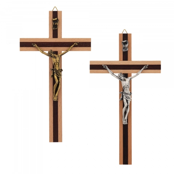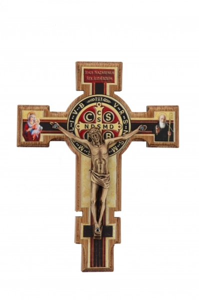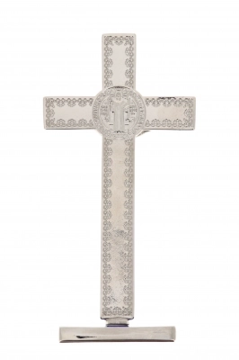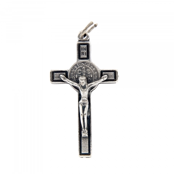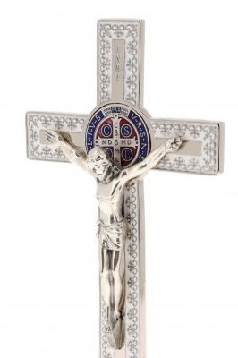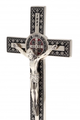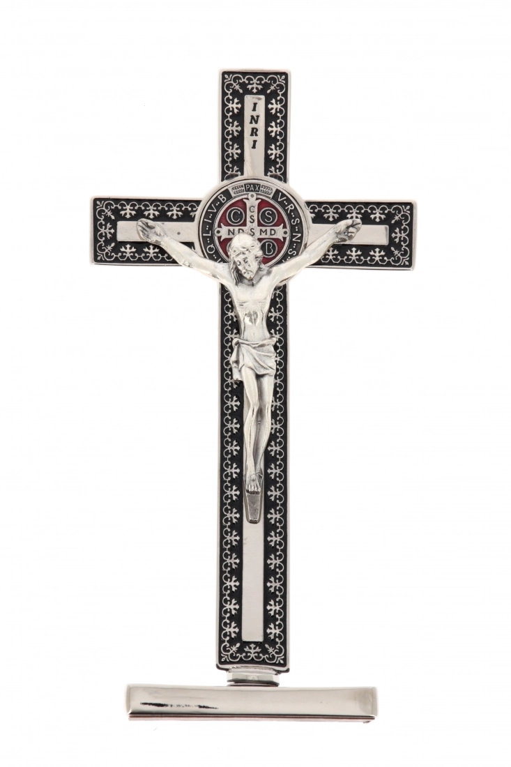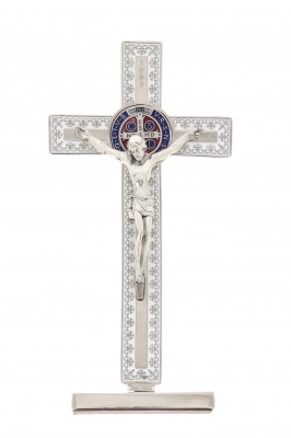 Bel crocifisso in metallo lavorato con base d'appoggio. L'interno del crocifisso è smaltato e al centro della croce è posizionata la medaglia di San Benedetto. Il corpo di Cristo è in metallo. Il prodotto, realizzato in Italia, è disponibile nei colori bianco, nero e blu.