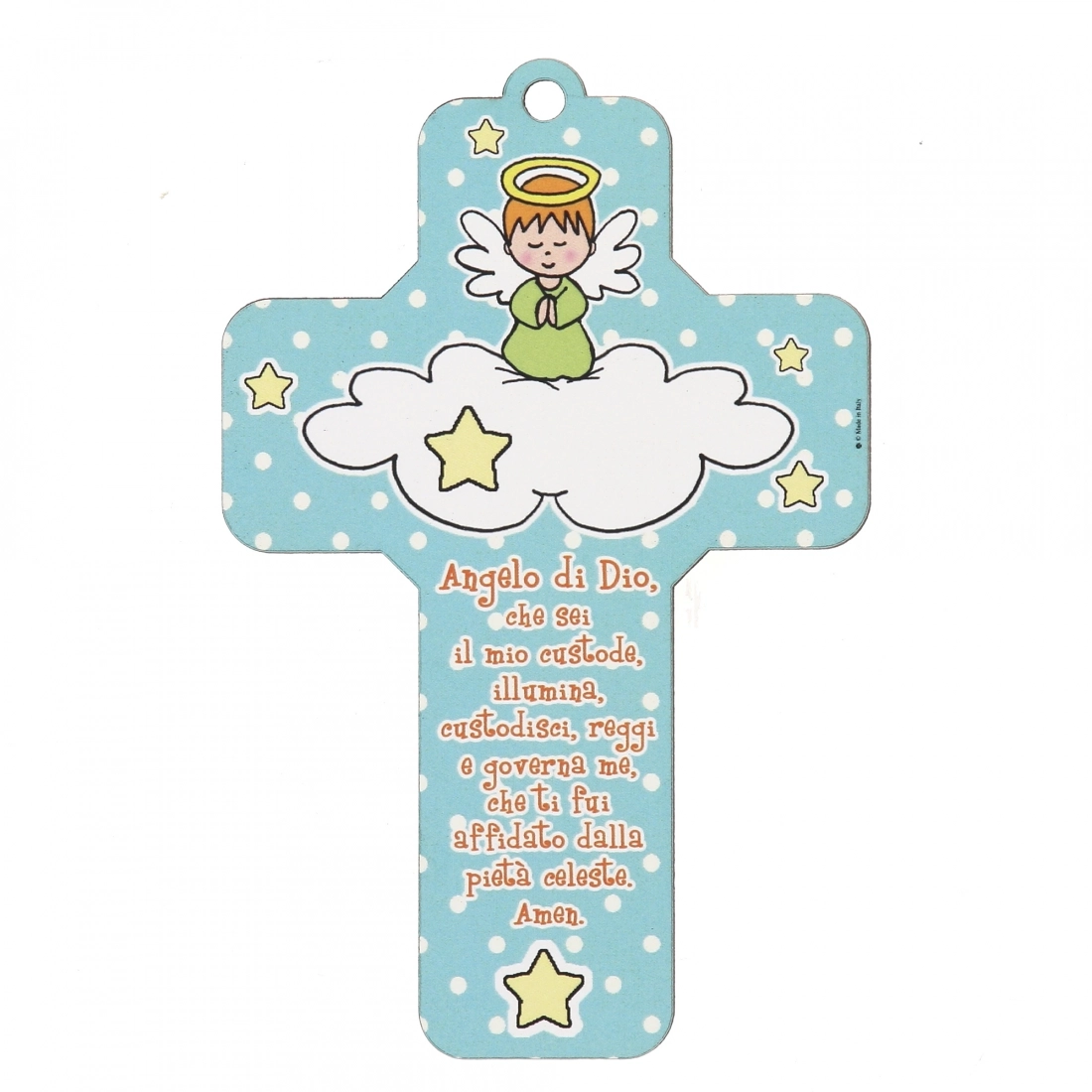 Simpatica croce in legno sulla quale è raffigurato un angioletto che prega e la preghiera "Angelo di Dio". È un significativo elemento d'arredo da appendere, per esempio nelle camerette. Ideale da regalare ai più piccoli.