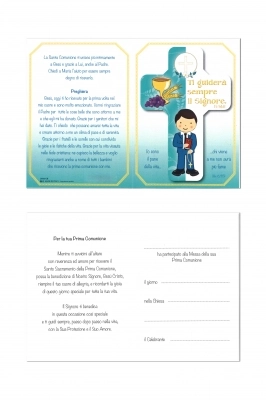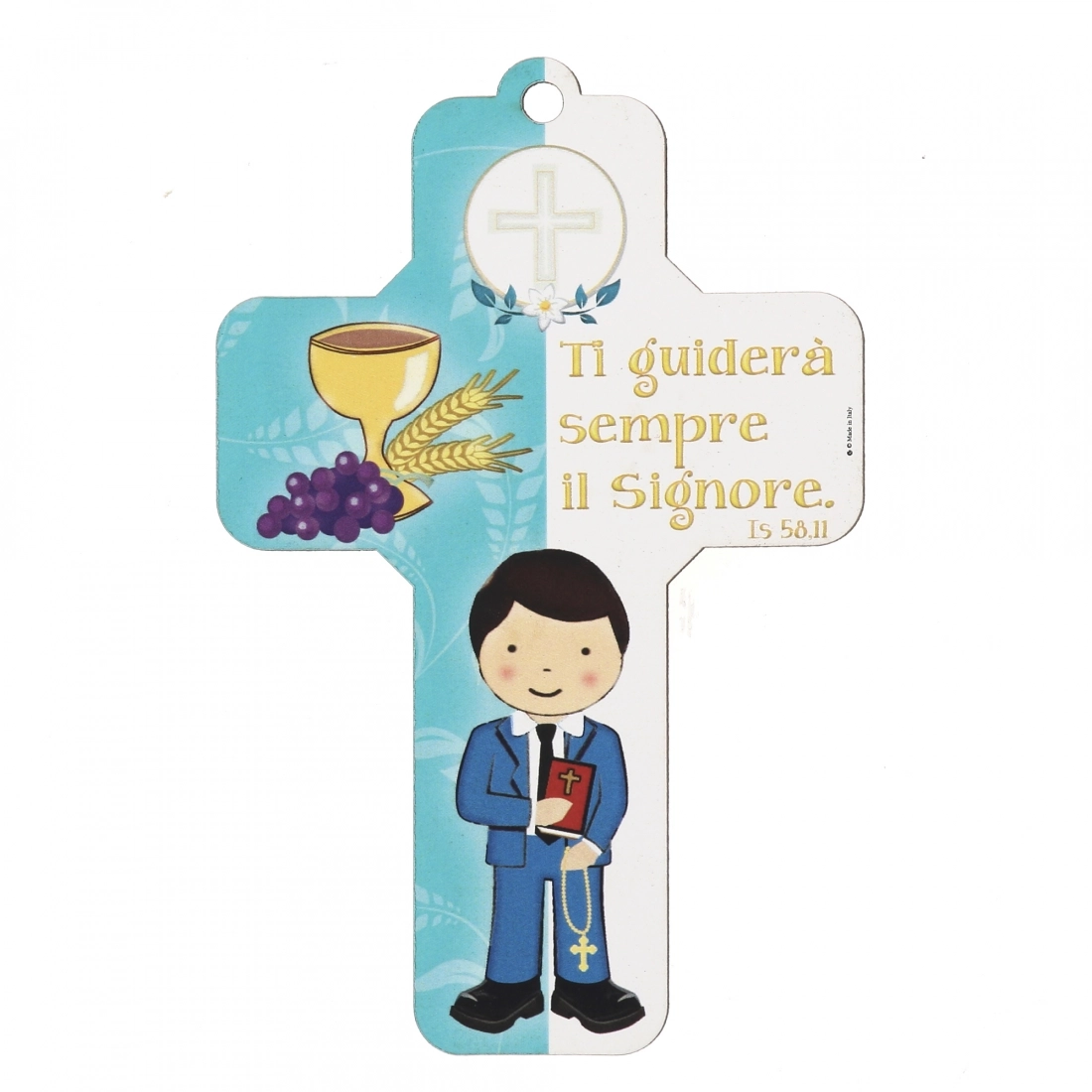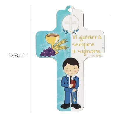 Bella croce da donare in occasione della Prima Comunione. Vi è raffigurata l'immagine di un bambino, sulla quale è riportata una frase emblematica tratta dal libro del profeta Isaia 58,11 "Ti guiderà sempre il Signore". Nella confezione è presente anche una pagellina compilabile con il nome di chi riceve questo importantissimo sacramento. È un significativo elemento d'arredo da appendere e un'ottima idea regalo.