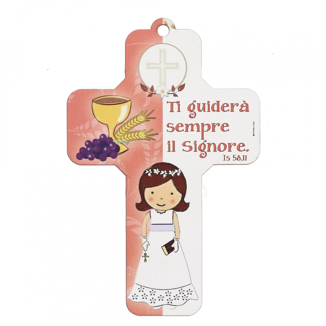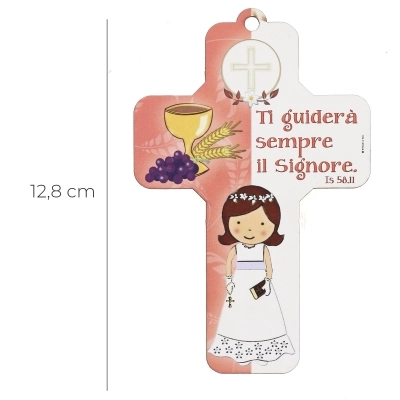 Bella croce da donare in occasione della Prima Comunione. Vi è raffigurata l'immagine di una bambina, sulla quale è riportata una frase emblematica tratta dal libro del profeta Isaia 58,11 "Ti guiderà sempre il Signore". Nella confezione è presente anche una pagellina compilabile con il nome di chi riceve questo importantissimo sacramento. È un significativo elemento d'arredo da appendere e un'ottima idea regalo.