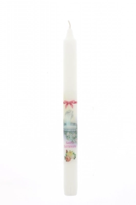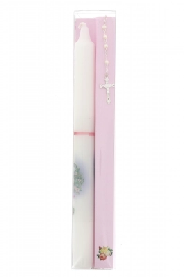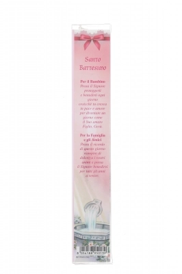 Candela per Battesimo, confezionata in una graziosa scatolina di plastica, con cartoncino colorato. Molto originale l'idea di inserire all'interno della confezione un rosario abbinato, a piccoli grani bianchi. Sul retro della confezione c'è una preghiera per la bambina e una per la famiglia. Con i suoi dettagli curati e la sua presentazione raffinata, è un prezioso ricordo e un elemento centrale della cerimonia del Battesimo. La sua fiamma delicata e simbolica aggiunge un tocco sacro e luminoso a questo momento speciale. Ottima idea regalo in occasione del Battesimo.