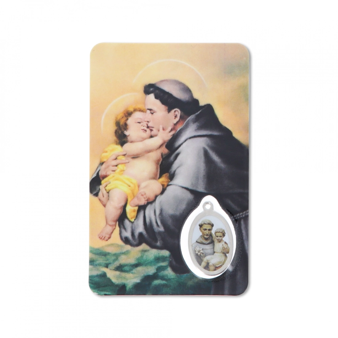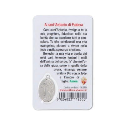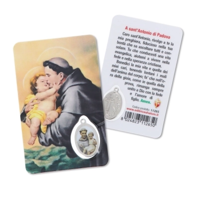 Card plastificata da collezione, delle dimensioni di 5,5 x 8,5 cm, con inserto medaglia dedicata al santo. La card è delle dimensioni di un bancomat, per cui può essere posta ovunque, anche dentro al portafogli, per portare con sè la protezione del santo ovunque si vada. Questa card è dedicata a sant'Antonio e sul retro si trova una preghiera in italiano rivolta a lui.