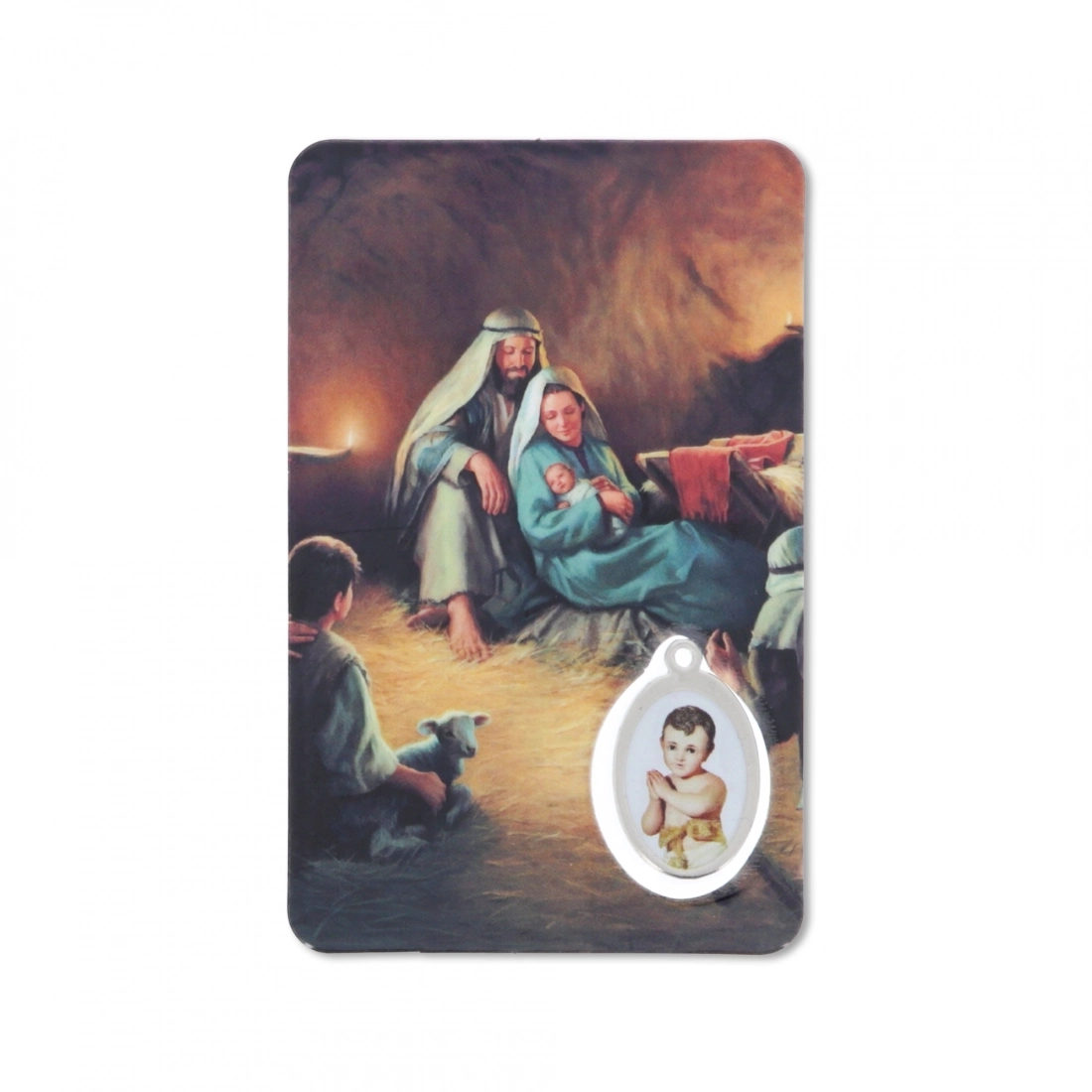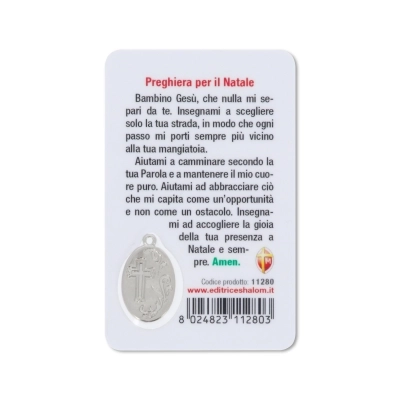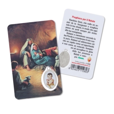 Card plastificata da collezione, delle dimensioni di 5,5 x 8,5 cm, con inserto medaglia che raffigura Gesù Bambino. La card è delle dimensioni di un bancomat, per cui può essere posta ovunque, anche dentro al portafogli, per portare con sè la protezione della santa Famiglia ovunque si vada. Questa card è dedicata al Santo Natale e sul retro si trova una bellissima preghiera in italiano rivolta a Gesù Bambino.