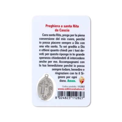 Card plastificata da collezione, delle dimensioni di 5,5 x 8,5 cm, con inserto medaglia dedicata alla santa. La card è delle dimensioni di un bancomat, per cui può essere posta ovunque, anche dentro al portafogli, per portare con sè la protezione della santa ovunque si vada. Questa card è dedicata a santa Rita e sul retro si trova una preghiera in italiano rivolta a lei.