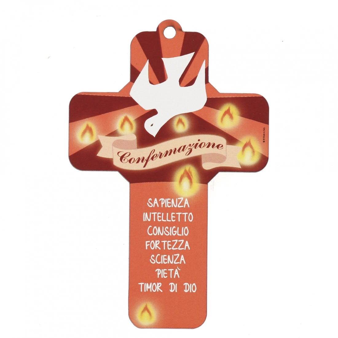 Bella croce da donare in occasione della Cresima. Vi sono sono riportati i 7 doni dello Spirito Santo: sapienza - intelletto - consiglio - fortezza - scienza - pietà - timor di Dio. Nella confezione è presente anche una pagellina compilabile con il nome di chi riceve questo importante sacramento, il giorno, nella Chiesa e il Celebrante. È un significativo elemento d'arredo da appendere e un'ottima idea regalo.