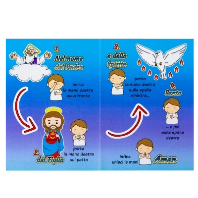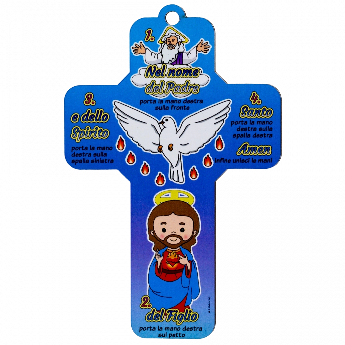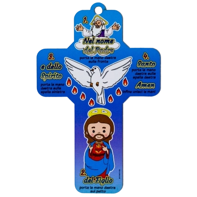 Croce in legno con Segno della Croce illustrato, pensata per accompagnare bambini, famiglie e catechisti nell’apprendimento della preghiera fondamentale della fede cristiana. La croce raffigura in modo semplice e colorato le tre Persone della Trinità – Padre, Figlio e Spirito Santo – con indicazioni chiare dei gesti da compiere durante il Segno della Croce, rendendola uno strumento educativo e spirituale di grande valore.