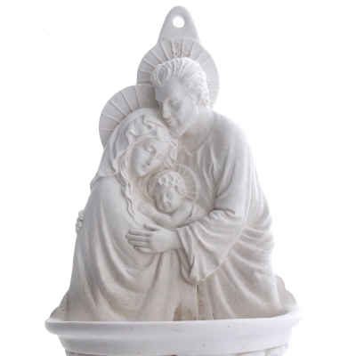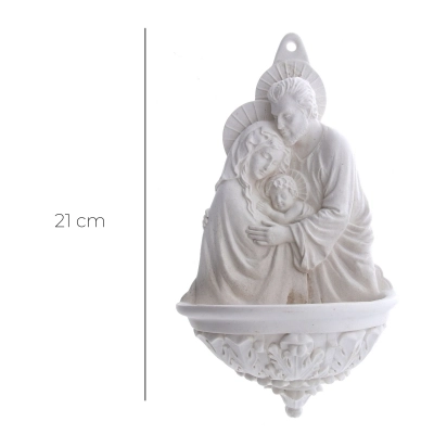 Acquasantiera in resina bianca, dell'altezza di 21 cm. È raffigurata la Sacra Famiglia, unita in un tenero abbraccio. Realizzata in Italia, può essere usata sia in luoghi di culto sia in casa. Può essere regalata o utilizzata come bomboniera, come segno di protezione. L'acqua santa infatti, è considerata un mezzo di purificazione e benedizione, utilizzata per proteggere e santificare le persone, gli oggetti e gli ambienti. È un simbolo di fede e di protezione spirituale per i fedeli. Inoltre, l'acquasantiera rappresenta un punto di riferimento per la preghiera e la riflessione all'interno delle chiese e delle case dei credenti.
