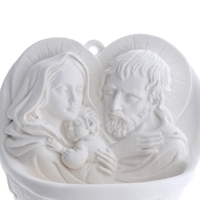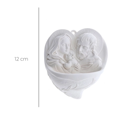 Acquasantiera in resina bianca, dell'altezza di 12 cm. È a forma di cuore e rappresenta la Sacra Famiglia. Realizzata in Italia, può essere usata sia in luoghi di culto sia in casa. Può essere regalata o utilizzata come bomboniera, come segno di protezione. L'acqua santa infatti, è considerata un mezzo di purificazione e benedizione, utilizzata per proteggere e santificare le persone, gli oggetti e gli ambienti. È un simbolo di fede e di protezione spirituale per i fedeli. Inoltre, l'acquasantiera rappresenta un punto di riferimento per la preghiera e la riflessione all'interno delle chiese e delle case dei credenti.