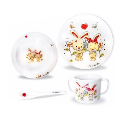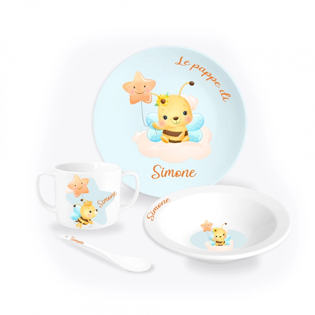 Questo set pappa in porcellana è personalizzabile e comprende: un piatto piano, un piatto fondo, una tazza con due manici e un cucchiano, tutti i pezzi sono decorati con la grafica scelta e il nome del bimbo o della bimba. Originale e utile idea regalo da donare per una nascita o anche per il primo compleanno. Il punto di forza di questo prodotto è proprio la personalizzazione, che lo rende un regalo unico e speciale! Disponibile in tre varianti grafiche. Il set pappa è certificato MOCA (Materiali e Oggetti a Contatto con Alimenti). Questa certificazione è necessaria a dimostrare l'ottemperanza alla normativa sulla sicurezza alimentare: i MOCA sono infatti regolamentati da provvedimenti nazionali e comunitari (UE). Tutto il set può essere lavato in lavastoglie.