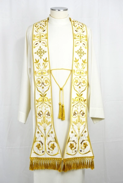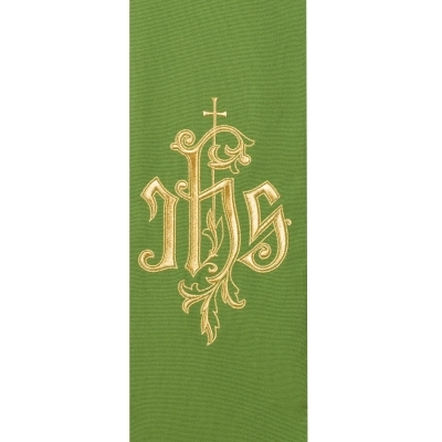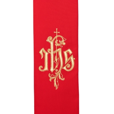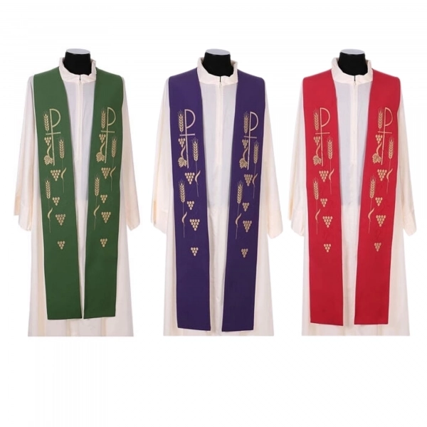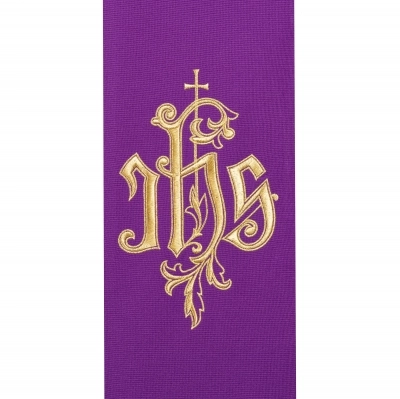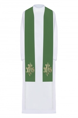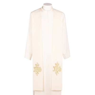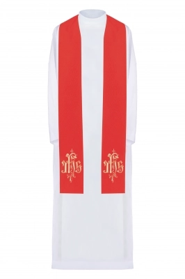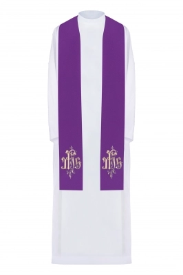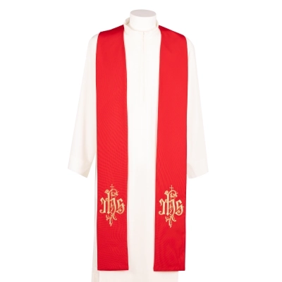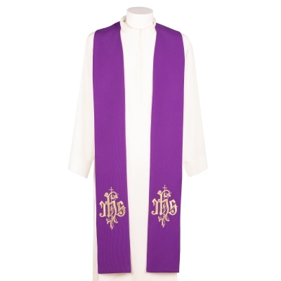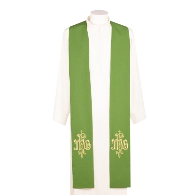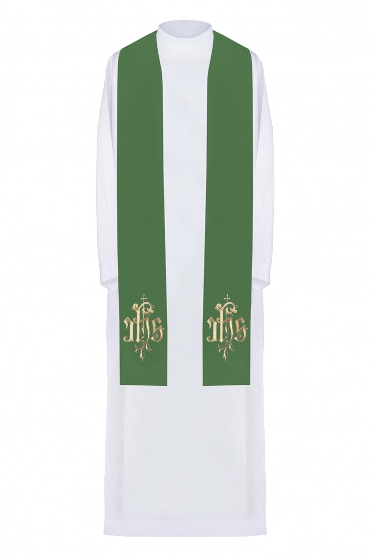 Stola in 100% poliestere con ricamo diretto dorato del trigramma JHS posto in entrambi i lati. Nella parte centrale, in alto della casula, è ricamata una croce dorata, che rimane dietro al collo quando indossata. La lunghezza della stola è di 256 cm, ideata per arrivare ben oltre al ginocchio del sacerdote che la indossa. Disponibile nei quatto colori liturgici più il colore rosa (che viene utilizzato nella terza domenica di Avvento e la quarta domenica di Quaresima).