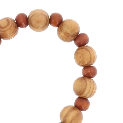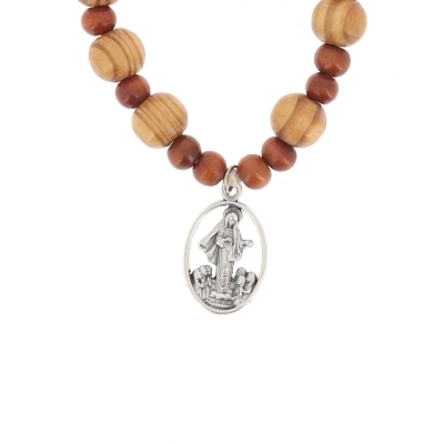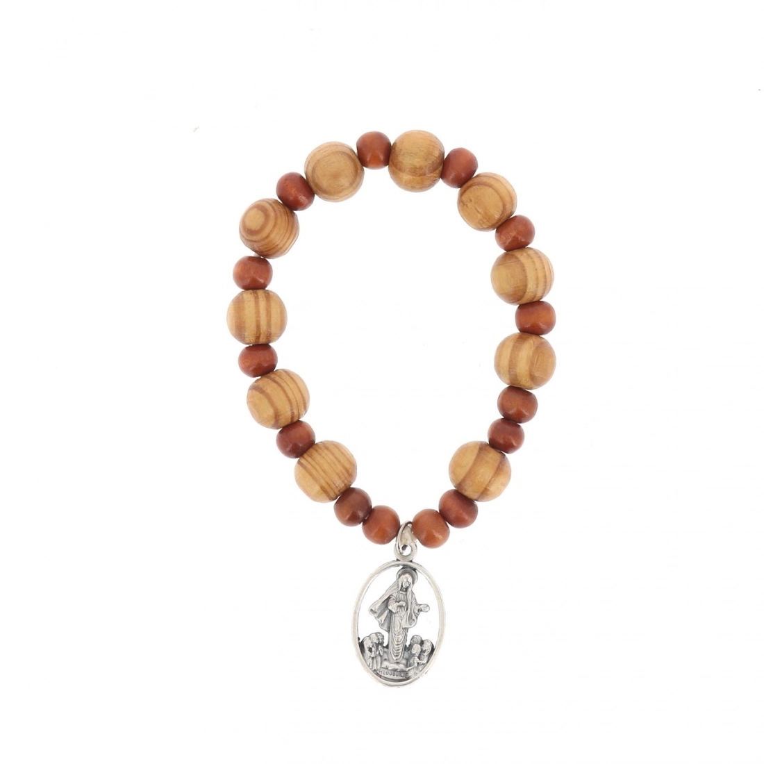 Bracciale decina del Rosario con grani in legno di pino, di colorazione molto simile al legno di ulivo. L'elastico su cui è montato il bracciale è molto resistente. La medaglia posta in fondo al bracciale ha la particolarità di essere forata ai lati e al centro è raffigurata la Madonna di Medjugorje. Carinissima idea regalo anche per uomo.