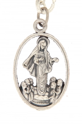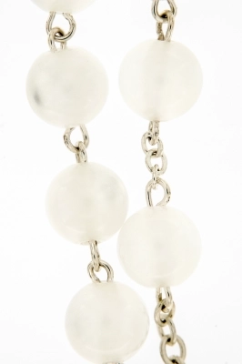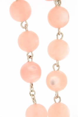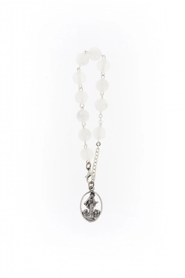 Bracciale decina del Rosario con grani grandi in imitazione madreperla. La medaglia posta in fondo al bracciale ha la particolarità di essere forata ai lati e al centro è raffigurata la Madonna di Medjugorje. Disponibile in tre varianti di colore: rosa, rosa più scuro e bianco. Indossabile al polso grazie al moschettone che ne consente l'apertura.