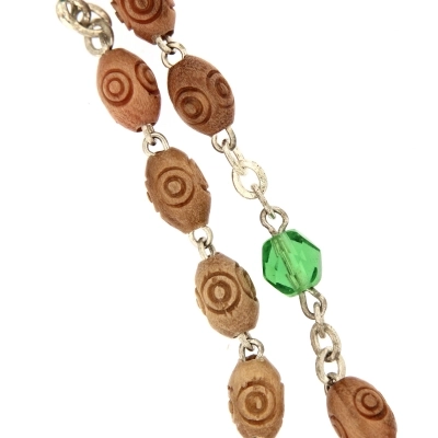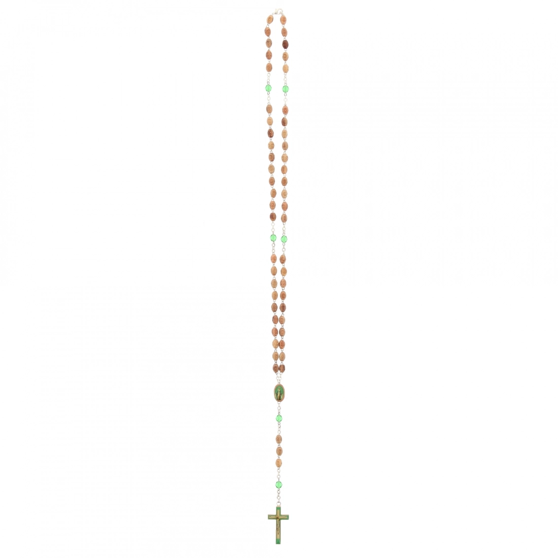 Carinissima corona del Rosario con grani in legno lavorato ovale, impreziosita dai grani del Pater in simil cristallo colorato. Sulla crociera è presente un'immagine adesiva resinata, raffigurante la Madonna Immacolata, che riprende il colore dei grani del Pater. Anche la croce finale presenta un'immagine resinata che raffigura Gesù in croce. La corona è indossabile grazie al moschettone che ne consente l'apertura.