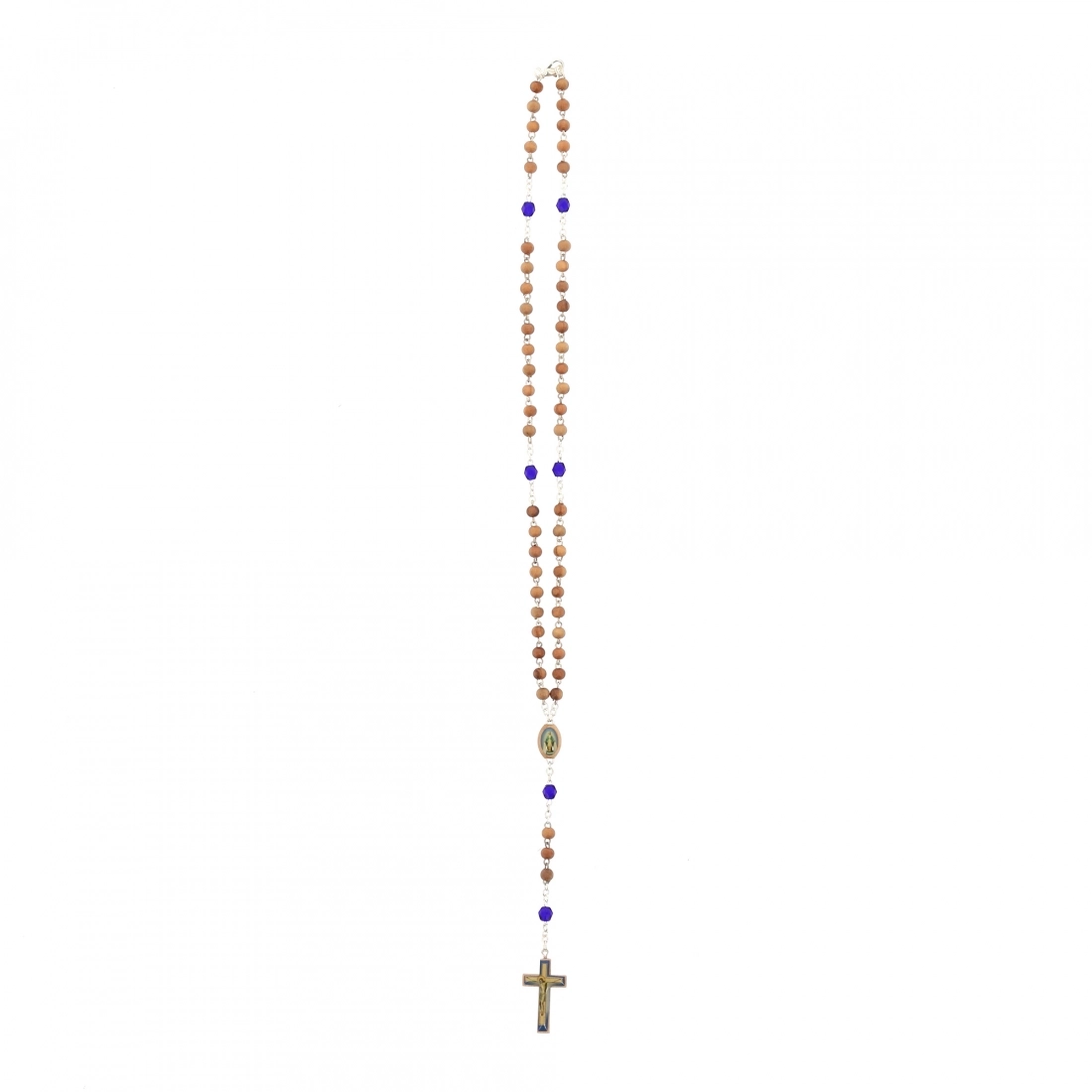 Semplice e carinissima corona del Rosario con grani in legno e Pater in simil cristallo blu. Sulla crociera è presente un'immagine adesiva resinata che raffigura la Madonna Immacolata. Anche la croce finale presenta un'immagine resinata che raffigura Gesù in croce. La corona è indossabile grazie al moschettone che ne consente l'apertura.