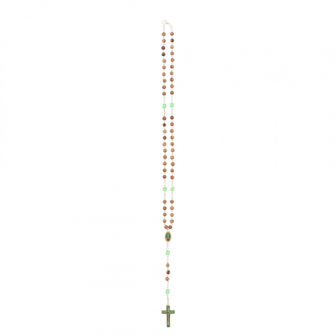 Raffinata corona del Rosario, molto delicata per la piccola dimensione del grano in legno tondo e per la presenza del grano del Pater che è in simil cristallo verde. Sulla crociera è presente un'immagine adesiva resinata che raffigura la Madonna Immacolata. Anche la croce finale presenta un'immagine resinata che raffigura Gesù in croce. La corona è indossabile grazie al moschettone che ne consente l'apertura.