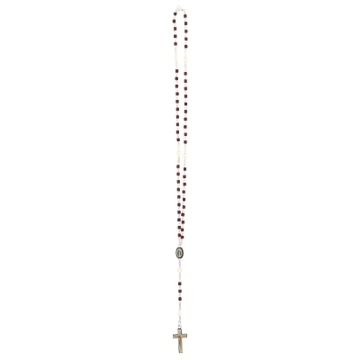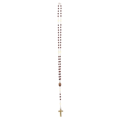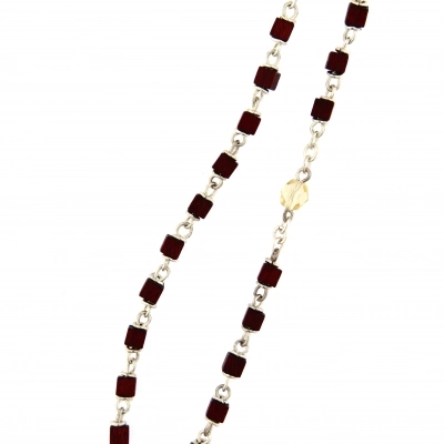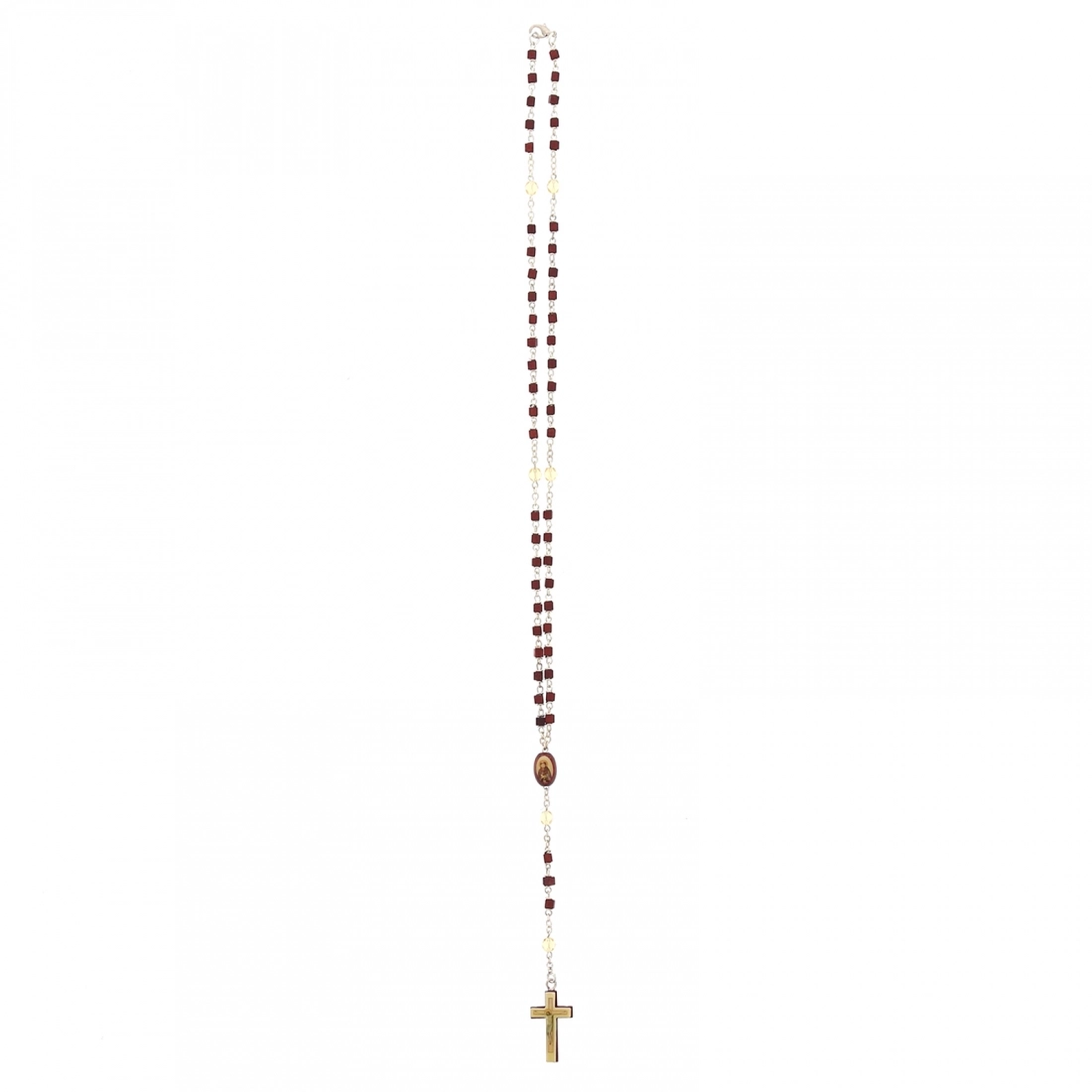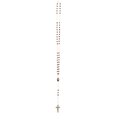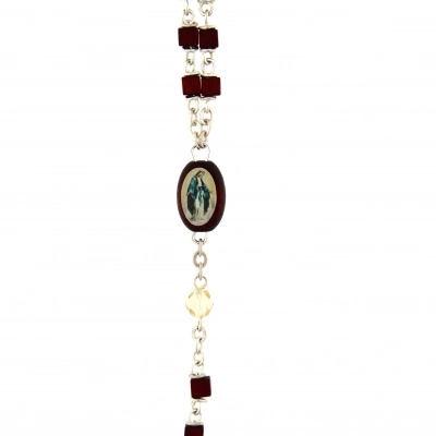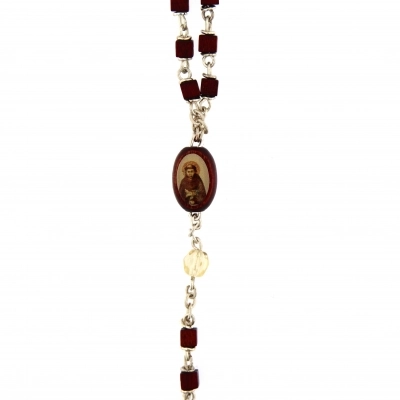 Deliziosa corona del Rosario con grani particolari a forma di cubetto in legno, resa ancora più raffinata dalla presenza dei grani Pater in simil cristallo giallo, molto tenue. La crociera presenta un'immagine resinata che raffigura san Benedetto oppure la Madonna Immacolata oppure san Francesco. Anche la croce finale presenta un'immagine resinata che raffigura Gesù in croce. La corona è indossabile grazie al moschettone che ne consente l'apertura.