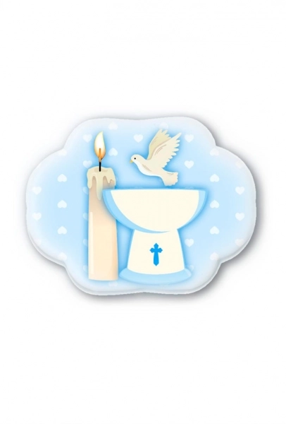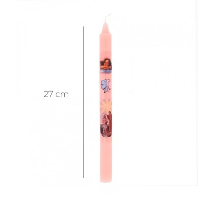 La candela, del peso di 80 grammi, misura 27 cm di altezza per 2 cm di diametro ed è decorata con un angelo, un'immagine di Gesù nel fiume Giordano che riceve il battesimo ed un fiocco.