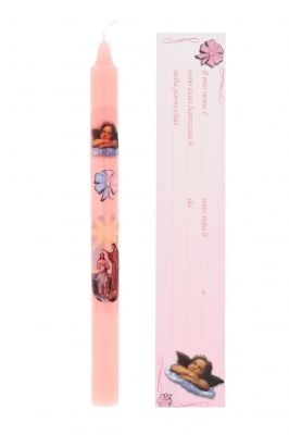 Candela Rosa per Battesimo in elegante confezione in plastica rigida appendibile.