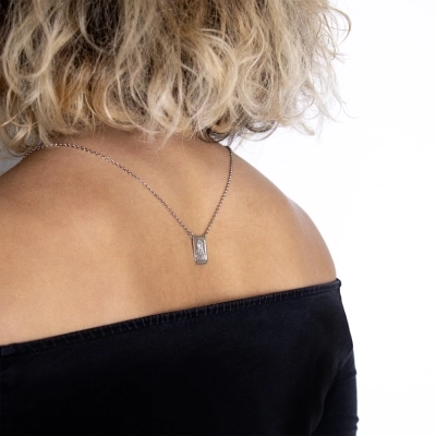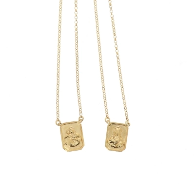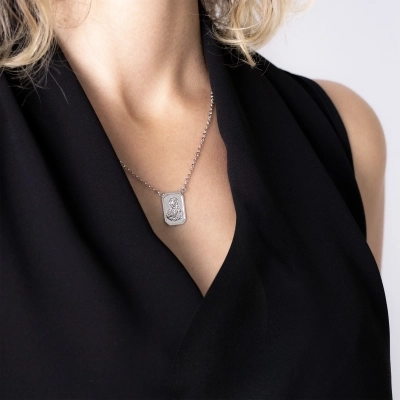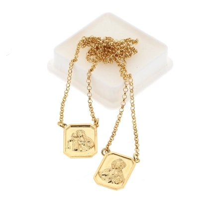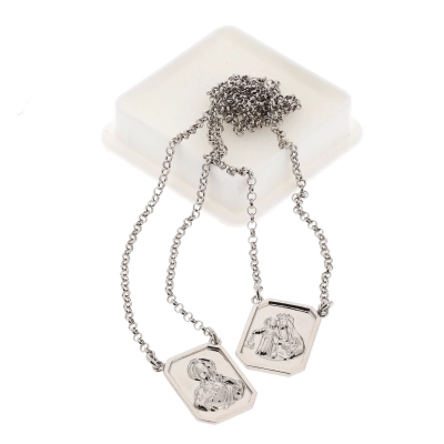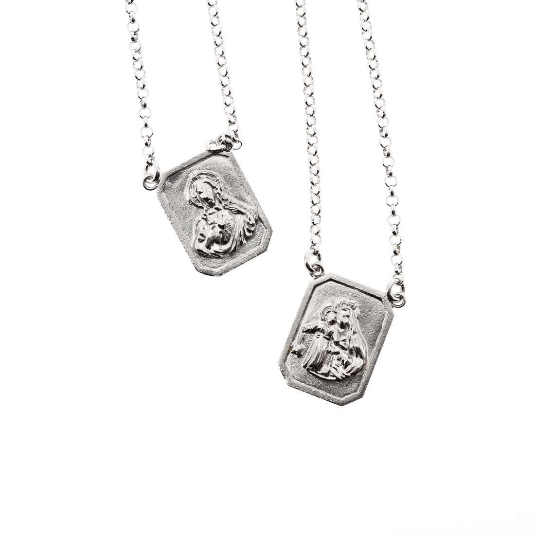 Delicatissimo e raffinato Scapolare del Carmelo in argento 925 rodiato. Grazie alla sua fattezza, lo scpolare è comodissimo da indossare quotidianamente. Come in tutti i classici scapolari, le medaglie sono rettangolari e hanno dimensioni di 1,9 cm di altezza e 0,9 cm di larghezza. Su una medaglia è raffigurato il Sacro Cuore di Gesù, mentre sull'altra la Madonna del Carmelo. La lunghezza della catenina è di 32,5 cm.