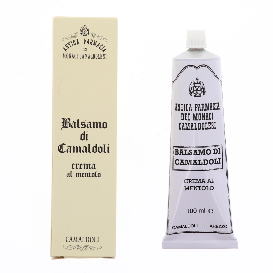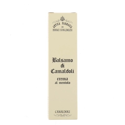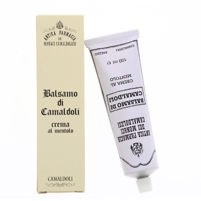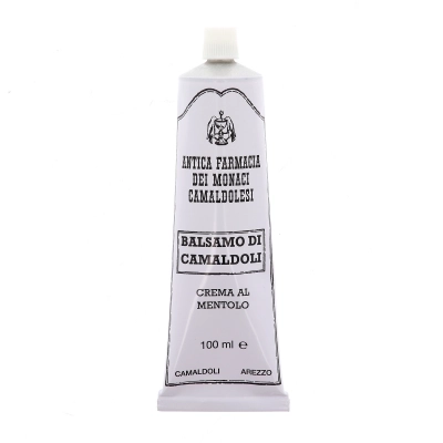Balsamo Crema al Mentolo dell'Antica Farmacia di Camaldoli, nella confezione da 100 ml. Il Mentolo è estratto dall'Olio della Menta Piperita, che ne è composta al 45%, ed è un rinfrescante impareggiabile. Nel Balsamo Crema prodotto dai monaci benedettini del Monastero ed Eremo di Camaldoli, il Mentolo è inserito all'interno del prodotto come coadiuvante nel trattamento delle contusioni, del torcicollo, dei dolori reumatici o come semplice rinfrescante.