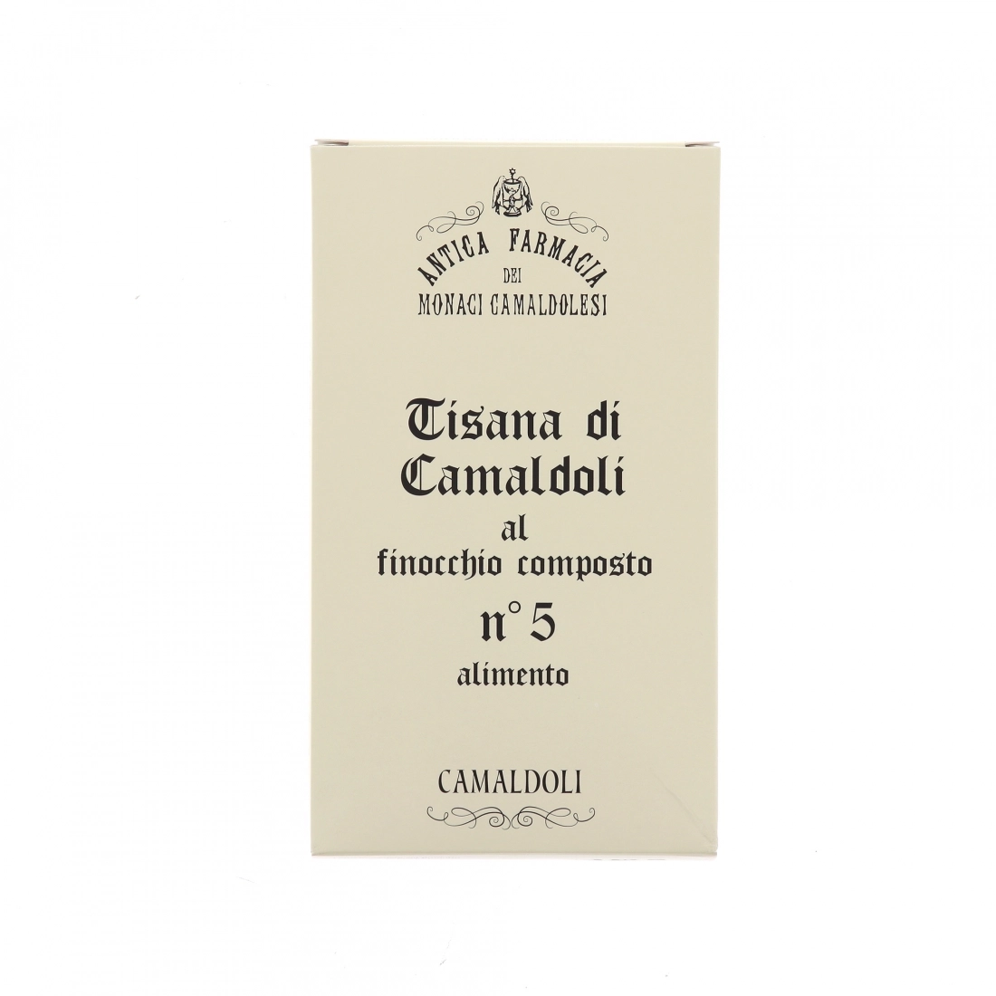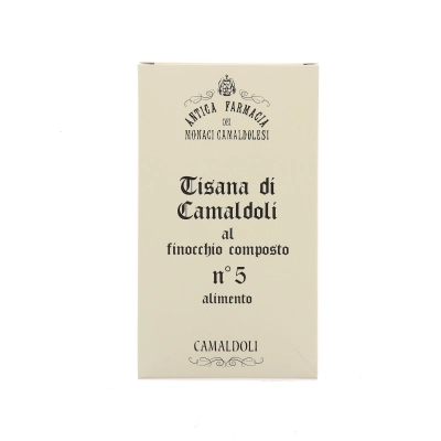 La tisana n. 5 di Camaldoli al Finocchio composto è un infuso che favorisce i processi digestivi. È un preparato di erbe digestive, efficace nel trattamento dei gonfiori addominali. Nella tisana sono presenti i semi del finocchio, valido sostegno per l’organismo grazie alla loro efficacia digestiva, carminativa e diuretica. La combinazione con erbe come la centaure e la lavanda, facilitano il processo digestivo con proprietà stimolanti e antisettiche. Il finocchio contiene anche acido folico, potassio e vitamina C, non solo favorisce la digestione, ma aumenta anche le difese immunitarie e contrasta l’anemia.