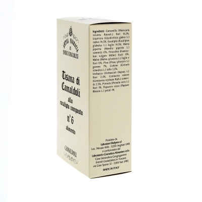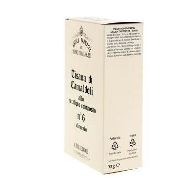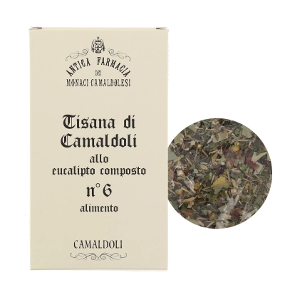 La tisana n. 6 balsamica all’Eucaliptus di Camaldoli può essere utile per contrastare i sintomi di tosse e raffreddore. Una tisana espettorante, tra le più apprezzate in assoluto. È indicata per il trattamento delle affezioni dell’apparato respiratorio, come tosse e raffreddore. In questa miscela erboristica troviamo la primula con proprietà analgesiche e antinfiammatorie; la liquirizia che protegge le mucose, rende il sapore gradevole e bilancia e il fresco sentore dell’eucalipto. Questo infuso balsamico calma la tosse, favorendo l’espettorazione e stimolando anche l’appetito; grazie alle proprietà emollienti della malva ha anche un’efficace azione antisettica. All'eucalipto sono attribuite numerose proprietà, come quelle antisettiche, antifungine, antinfiammatorie, iperemiche ed espettoranti secretolitiche. Grazie alle proprietà antinfiammatorie, antisettiche, balsamiche ed espettoranti, fin dall’antichità viene utilizzato tramite le sue foglie e il suo olio essenziale per il trattamento di tossi, bronchiti e affezioni catarrali delle vie respiratorie.