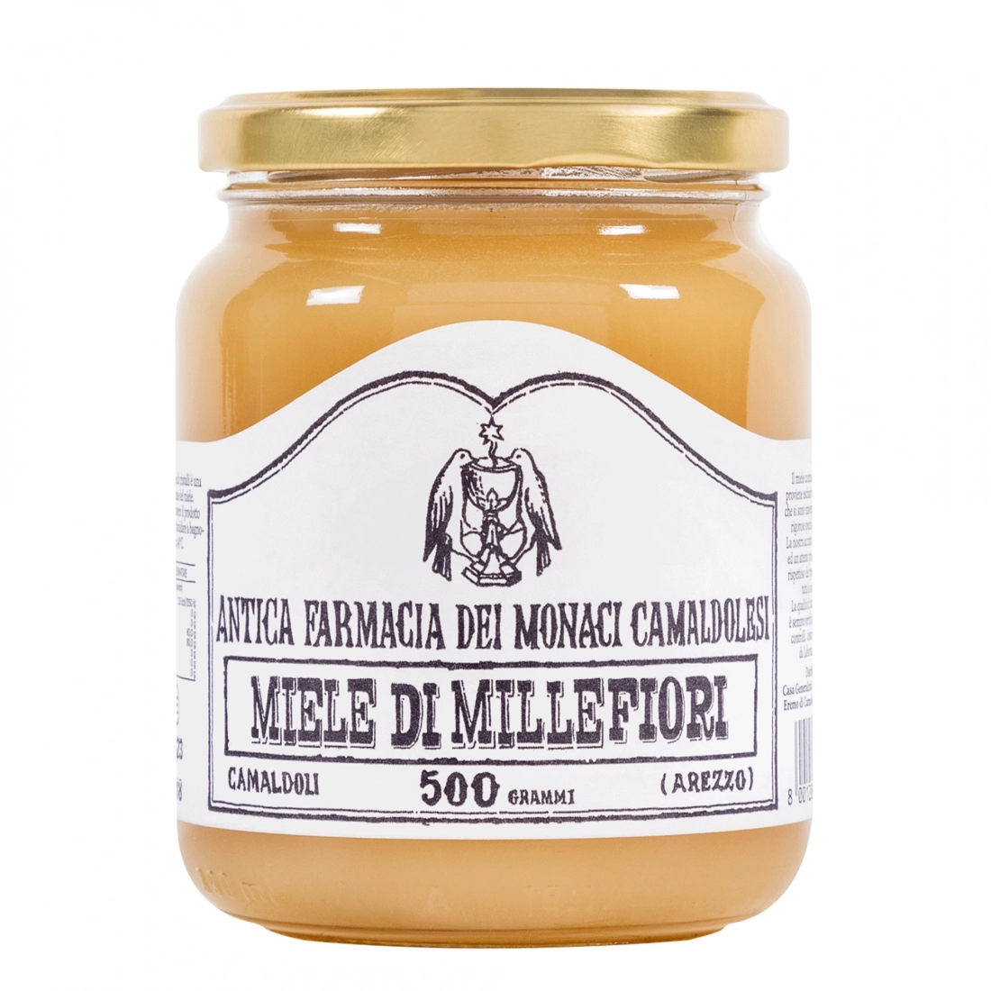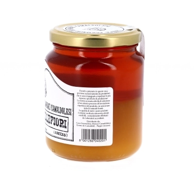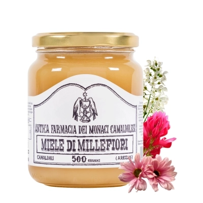Miele millefiori prodotto per l’Antica Farmacia dei Monaci Camaldolesi da apicoltori che rispettano ferree regole imposte dal Monastero stesso. Il miele è noto per essere un ottimo antibatterico, ricco di minerali e antiossidanti, e perfetto per donare energia a bambini e anziani. Privo di OGM, glutine e allergeni. L’eventuale formazione di cristalli non pregiudica la qualità del prodotto ed è una caratteristica naturale del miele. Per renderlo di nuovo liquido, basta scaldarlo a bagnomaria a circa 40 gradi centigradi. È disponibile in confezione da 500 gr.