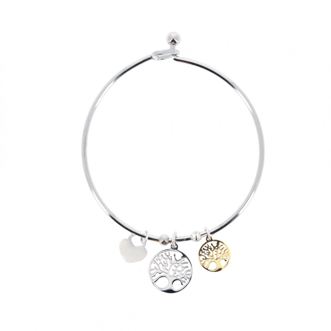 Bracciale rigido tubolare, con chiusura a incastro e ciondoli bicolore: uno un po' più grande color argento e uno un po' più piccolo dorato.  In entrambi i ciondoli è presente l'albero della vita, simbolo di prosperità, salute e buona fortuna per tutti coloro che lo portano con sé in un gioiello. Questo bracciale è un oggetto raffinato e significativo da regalare e regalarsi! Prodotto realizzato in acciaio di ottima qualità.